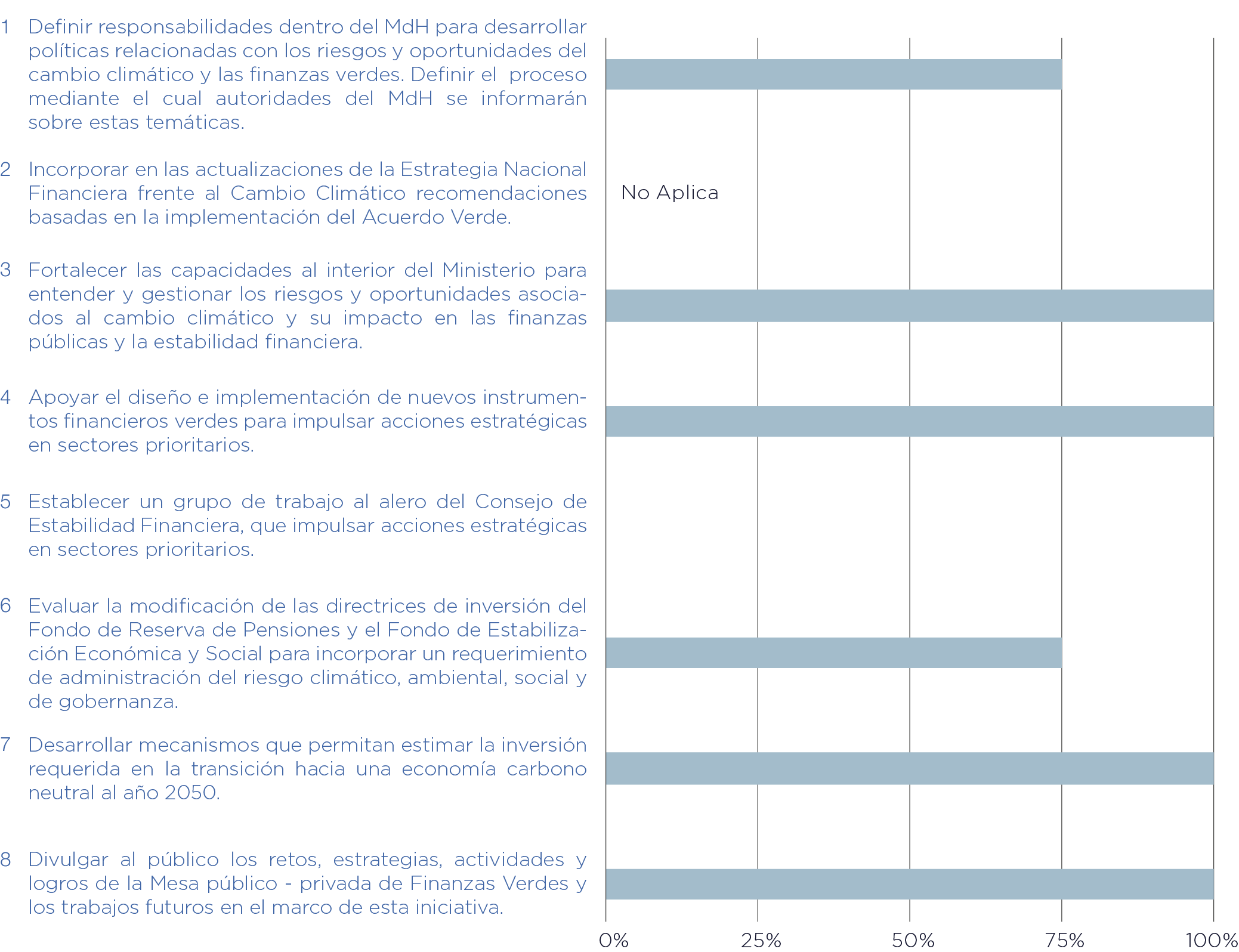 El Ministerio de Hacienda, en su calidad de Autoridad Financiera, asumió 8 compromisos. Nuevamente es importante mencionar que el segundo compromiso no es aplicable a la fecha. El Ministerio de Hacienda tiene un porcentaje de progreso total de los compromisos voluntarios adquiridos equivalente a un 79% y los avances para cada uno de los compromisos se pueden observar en el gráfico a continuación.