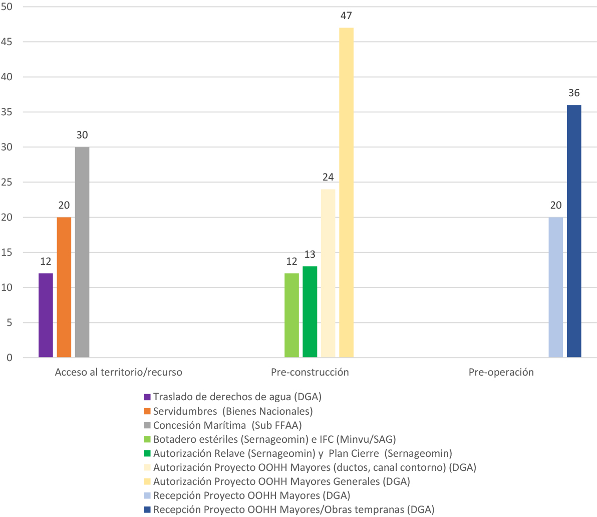 Sea que ello provenga de aguas continentales o a partir de su obtención desde el mar, los permisos requeridos ante diversas autoridades implican extensos plazos de tramitación, con 20 meses para la tramitación de una solicitud de relocalización de derechos de aguas ante la DGA o de 30 meses para la obtención de una concesión marítima que permita acceder al borde costero para obtener dicho recurso.