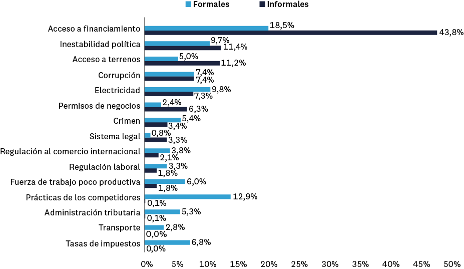 Fuente: La Porta y Shleifer (2014), basado en los datos del World Bank Enterprise Survey. Nota: La figura presenta el porcentaje de emprendedores formales e informales que identifican un obstáculo como el más importante para hacer negocios.