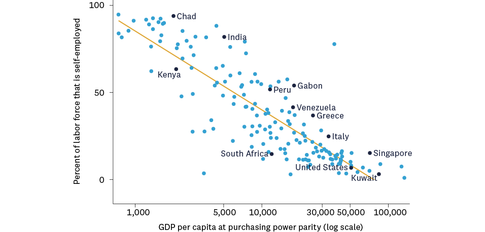 Fuente: La Porta y Shleifer (2014) en base a World Development Indicators. Nota: La figura presenta la relación entre empleo por cuenta propia y PIB per cápita para un conjunto de países en 2013. Para ello grafica en el eje vertical la proporción de la fuerza laboral que posee un empleo por cuenta propia y en el eje horizontal el logaritmo del PIB per cápita en expresado en paridad de poder de compra (PPP).