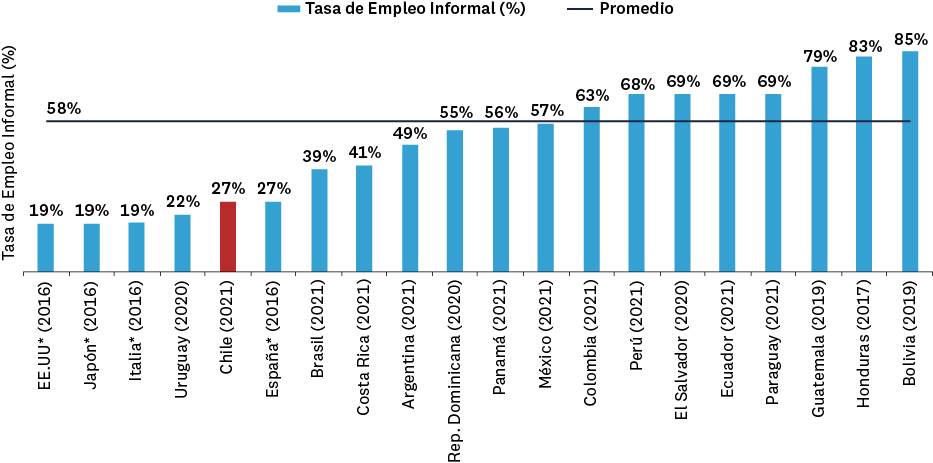 Fuente: Elaboración propia utilizando datos de ILOSTAT (2022) y OIT (2018). Notas: (a) Para Chile se utilizan datos de la Encuesta Nacional de Empleo (ENE) para 2021. Para el resto de los países, se utilizan encuestas de hogares y empleo que varían entre 2017 y 2021. Entre paréntesis se indican los años para los cuales se disponen dichos datos. (b) En el caso de EE. UU, Japón, Italia y España se presenta la proporción del empleo informal sobre el empleo total para 2016 reportada por la OIT (2018), los cuales si bien no son exactamente comparables con las cifras reportadas para los otros países del gráfico (debido a las fuentes de información utilizadas y los criterios empleados en la construcción de las estadísticas), se utilizan para efectos referenciales y se marcan con un asterisco (*) para diferenciarlos del resto de los países. (c) El promedio presentado en el gráfico excluye a EE. UU., Japón, Italia y España.