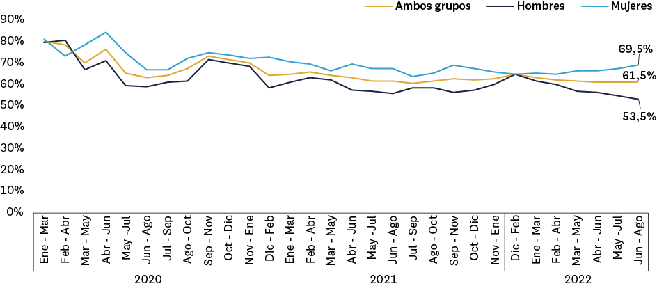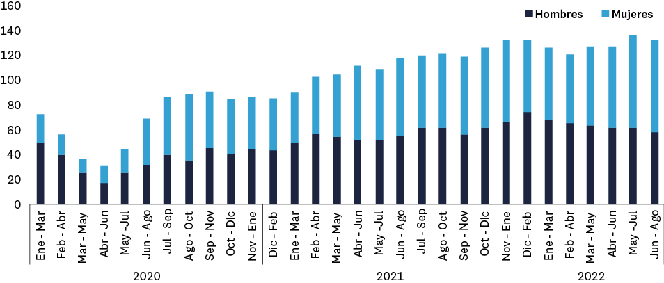 (ene-mar 2020 – jun-ago. 2022; personas y % según corresponda)