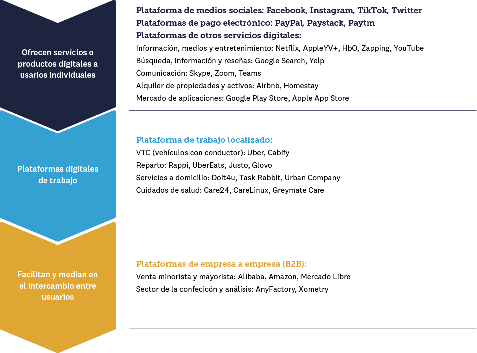 Otro desarrollo tecnológico de los últimos años ha sido las plataformas digitales, las que de acuerdo a la OIT (2021) pueden clasificarse en tres grandes categorías: las que ofrecen servicios o productos a usuarios individuales (por ejemplo mediante motores de búsqueda); las que intermedian servicios entre distintos usuarios facilitando su labor (de empresa a empresa); y, las plataformas digitales de trabajo que mediante aplicaciones online permiten conectar la oferta y la demanda de empleo de forma sencilla y rápida, posibilitando el desarrollo de una amplia gama de tareas de diversa complejidad y en las cuales se centrarán los siguientes párrafos.