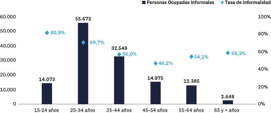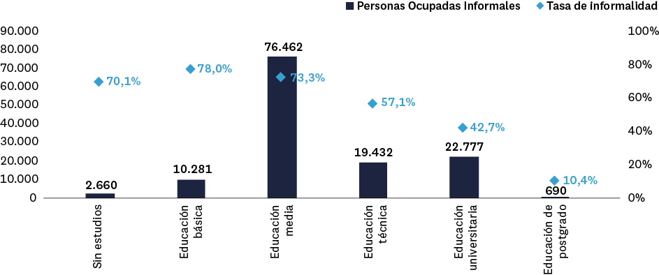 En efecto, a nivel nacional las plataformas digitales de trabajo ofrecen oportunidades a las personas para insertarse en el mercado laboral y obtener fuentes alternativas de ingresos, sin embargo presentan tasas de informalidad bastante superiores a las observadas a nivel nacional. De las 215 mil personas que reportaron trabajar en plataformas digitales en el trimestre móvil junio-agosto de 2022, 132 mil son informales de acuerdo con la definición del INE, lo que equivale a una tasa de informalidad de 61,5%, siendo mayor en las mujeres (Paneles a y b, Figura 22). En las plataformas digitales la informalidad se concentra principalmente en los jóvenes entre 25 y 44 años, con educación media y en menor medida con educación técnica y universitaria; y personas que se desempeñan principalmente en los sectores de transporte, manufactura y comercio (Paneles c, d y e, Figura 22).