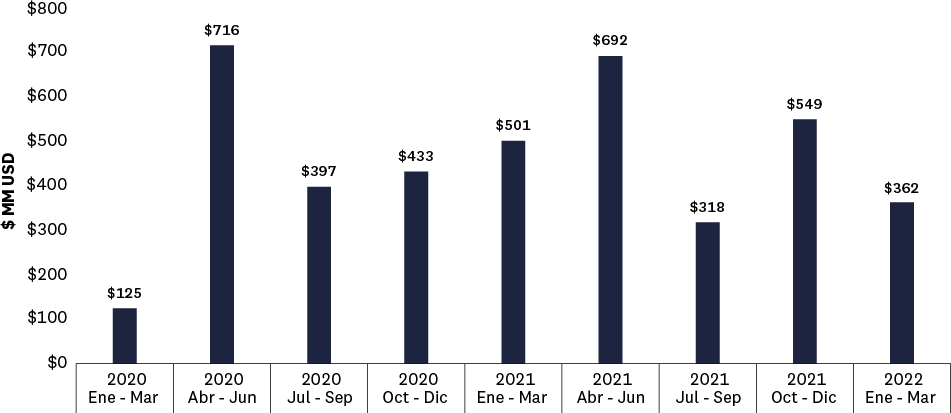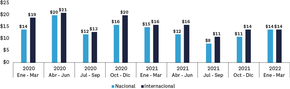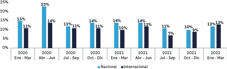 (ene-mar 2020 – 2022; % y $ nominales de cada año)