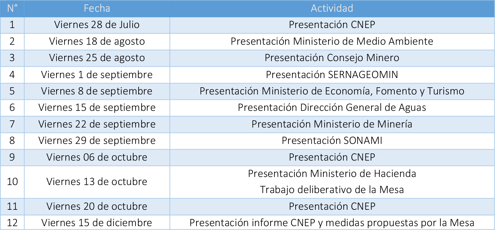 Entre julio y diciembre de 2023, se realizaron 12 sesiones de trabajo en las cuales las instituciones (públicas y privadas) expusieron su visión respecto del sistema de permisos en Chile, relacionados con la inversión en proyectos mineros. En la Tabla 1 se informan las sesiones e institución relatora en cada oportunidad.