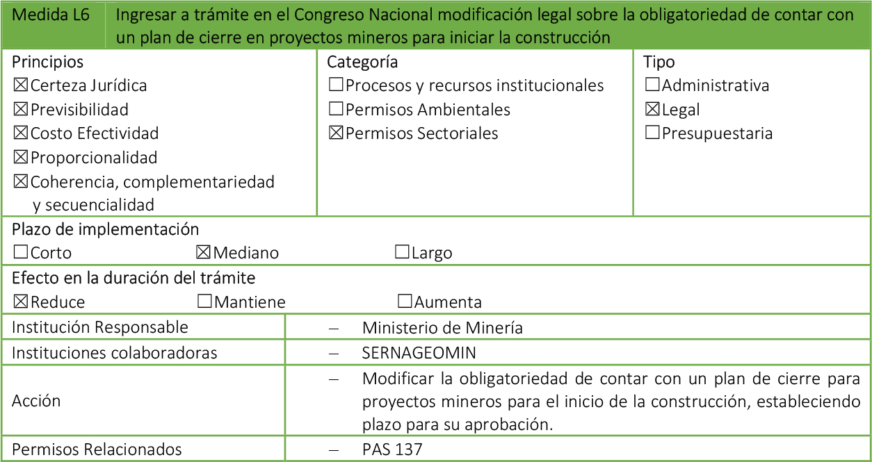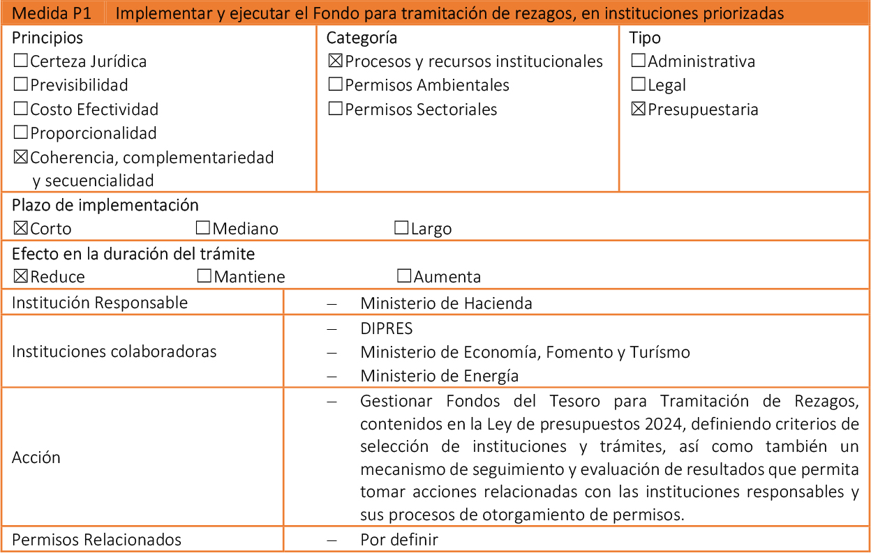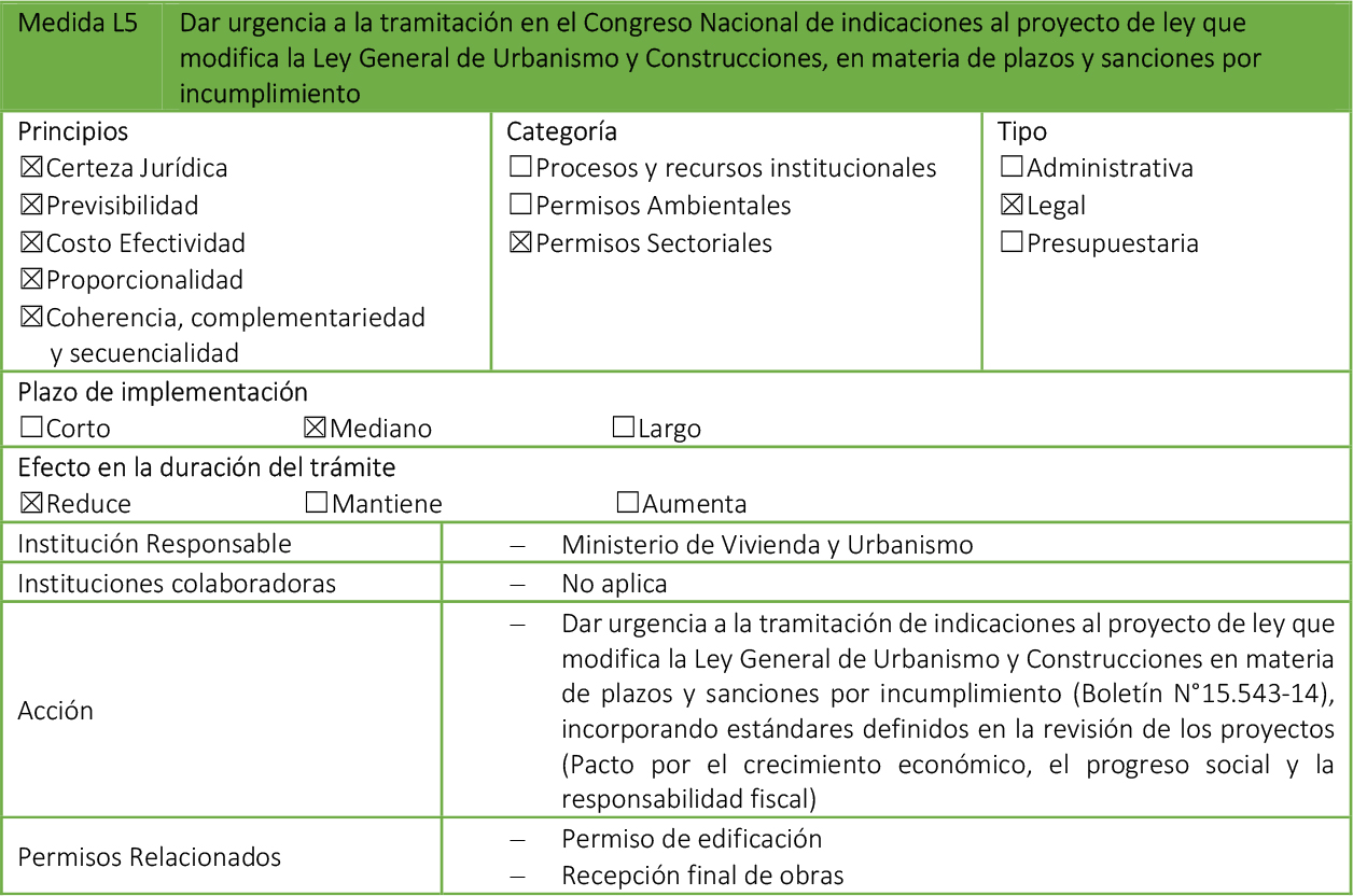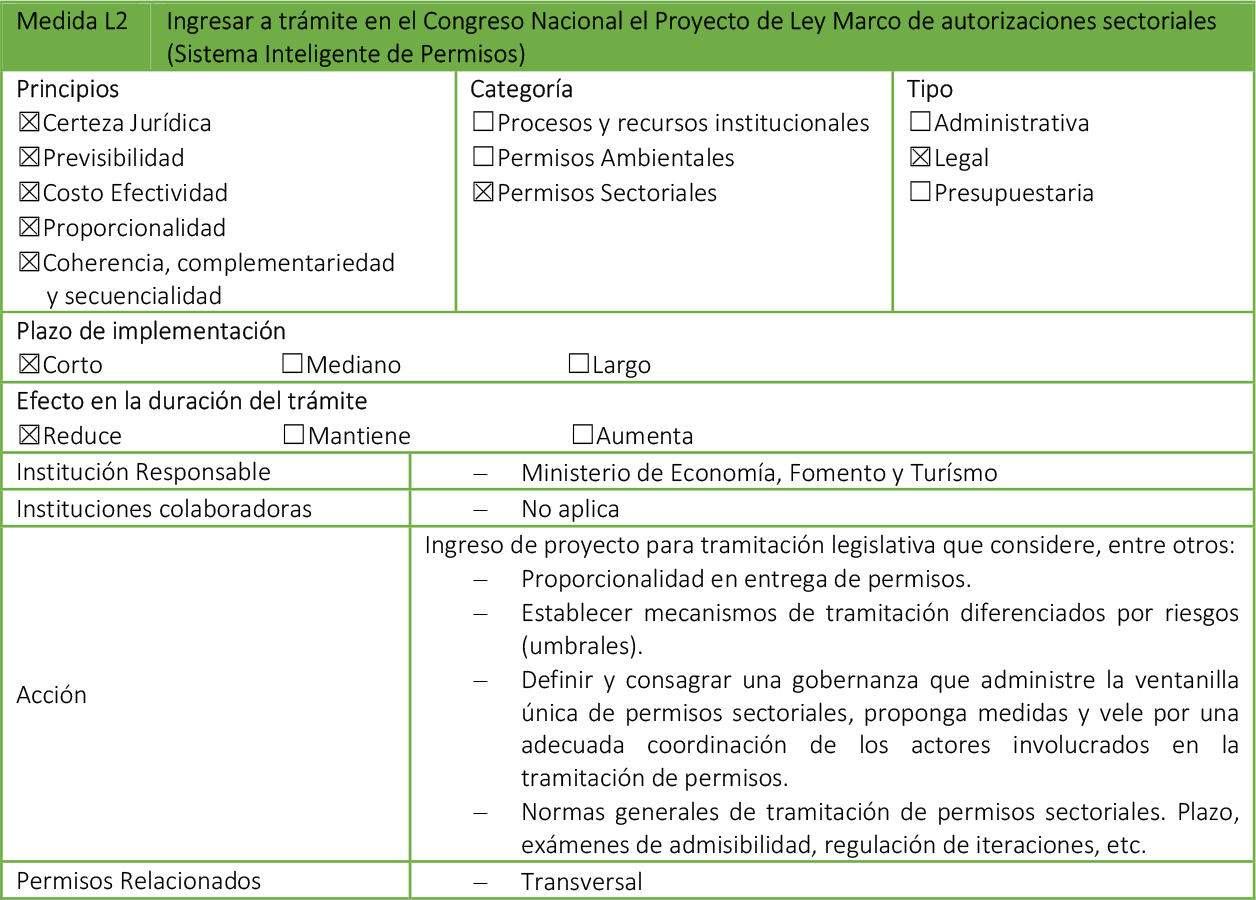- Medidas Legales: Paquetes de modificaciones legales, que requieren su tramitación en el Congreso Nacional, además de que pueden impactar en otros cuerpos normativos.