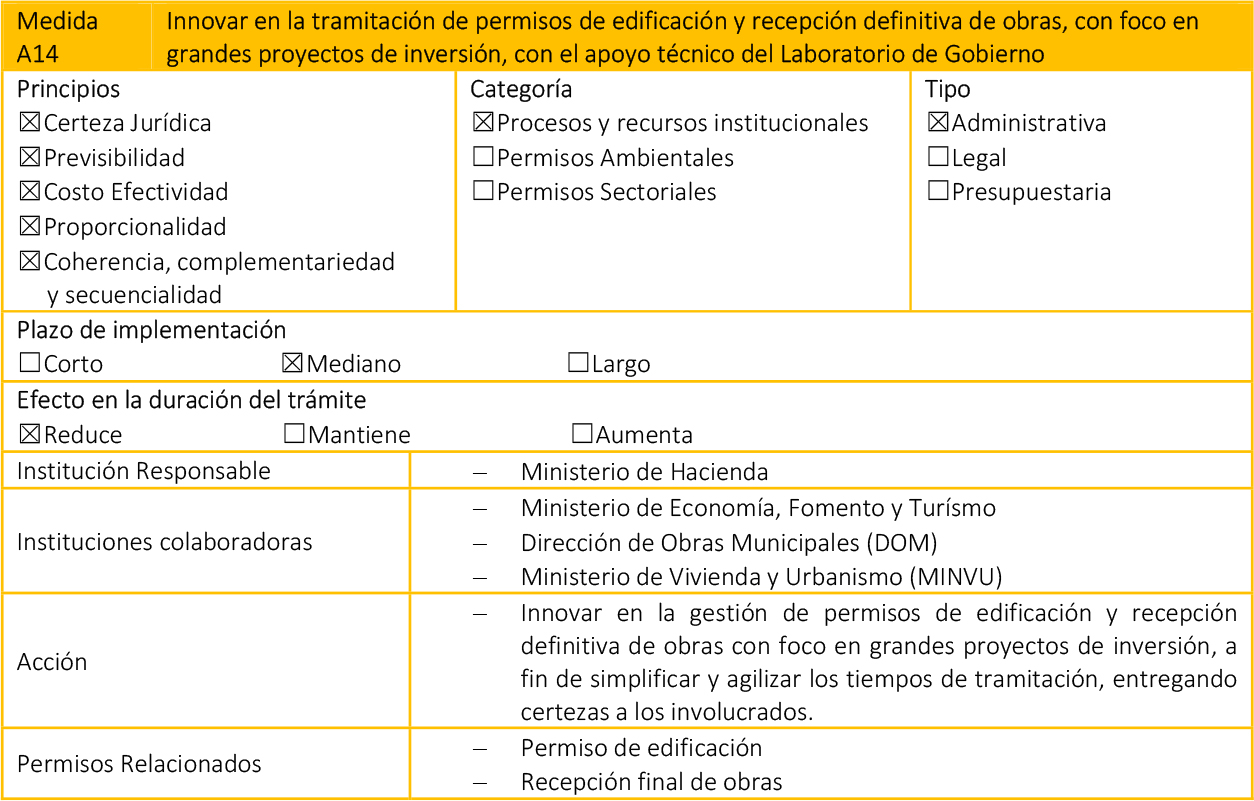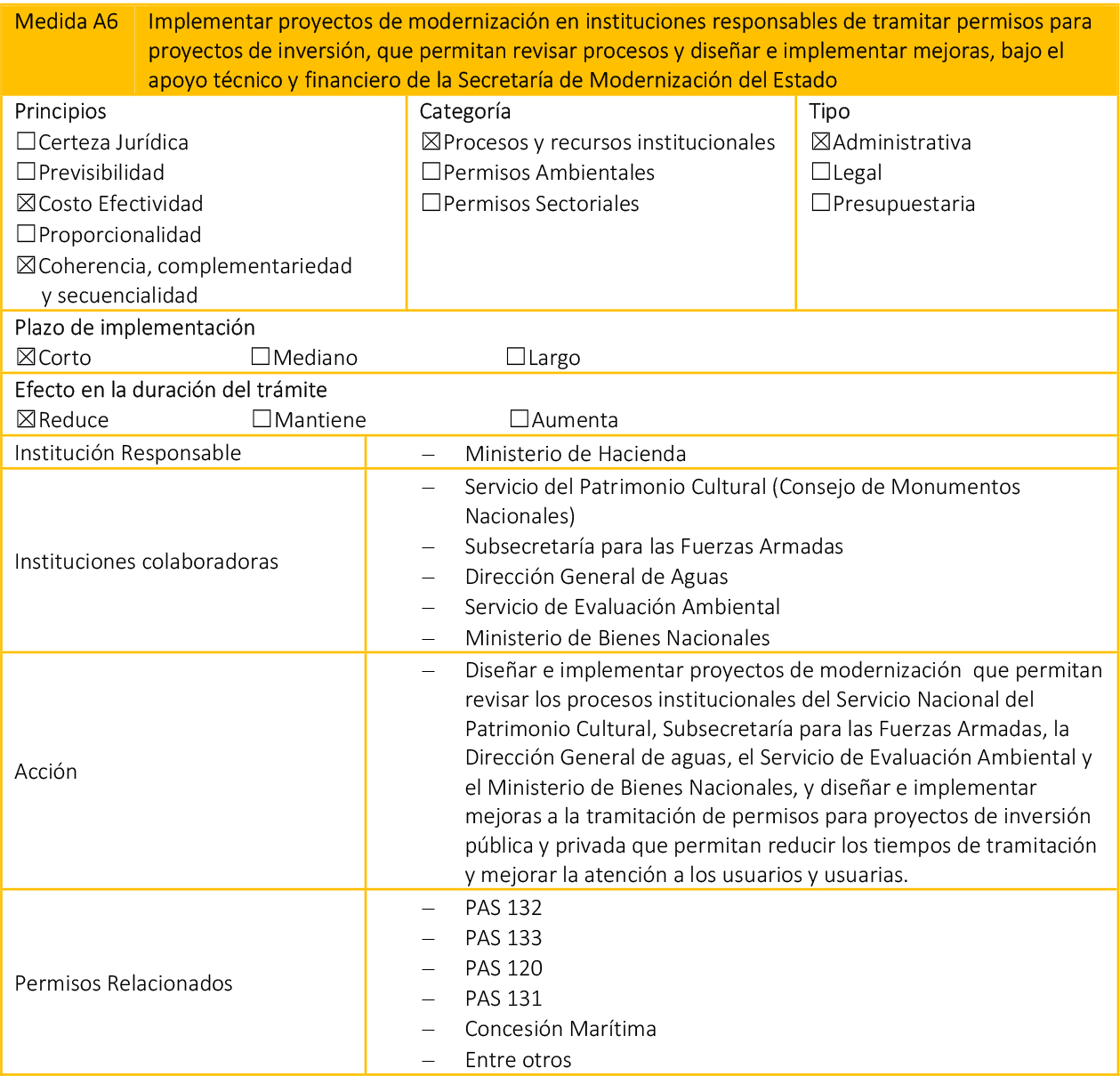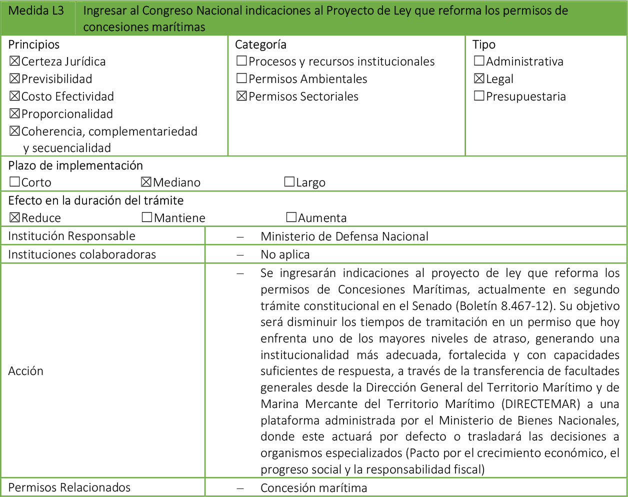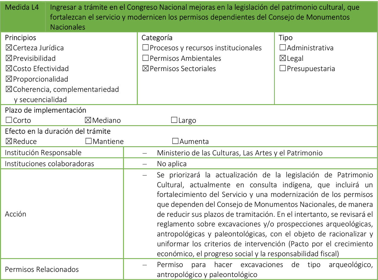 - Medidas Legales: Paquetes de modificaciones legales, que requieren su tramitación en el Congreso Nacional, además de que pueden impactar en otros cuerpos normativos.