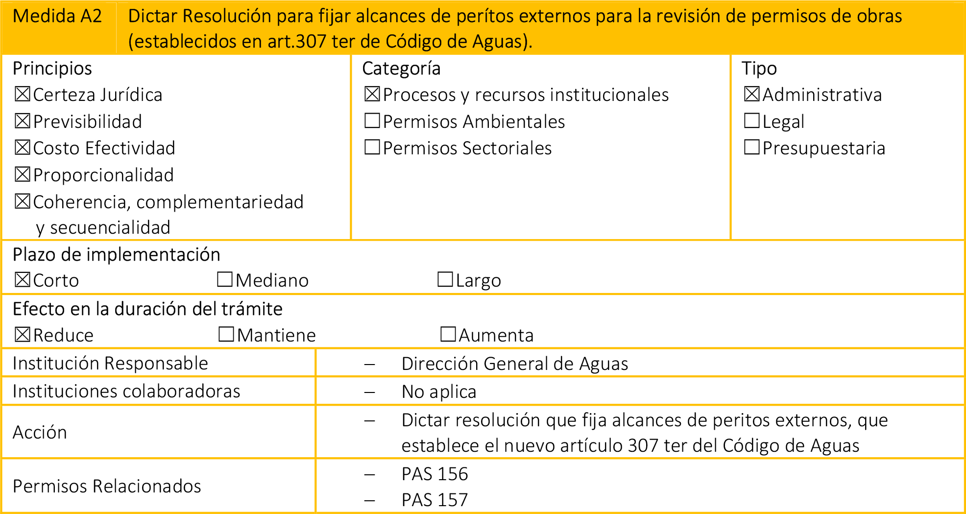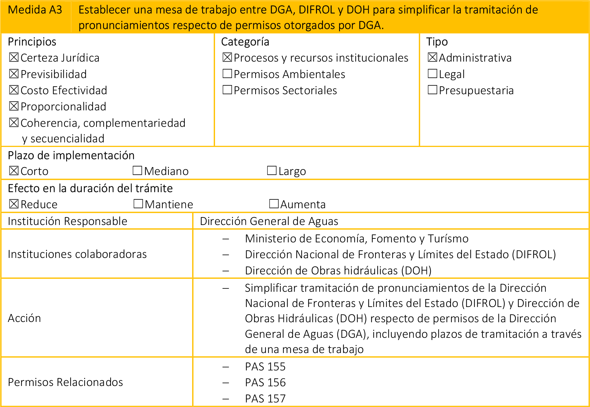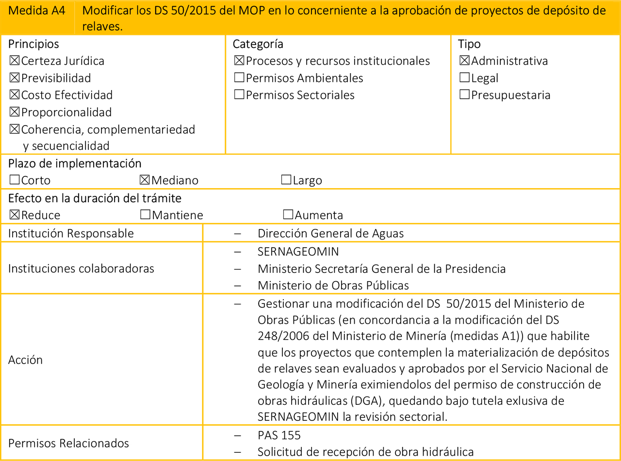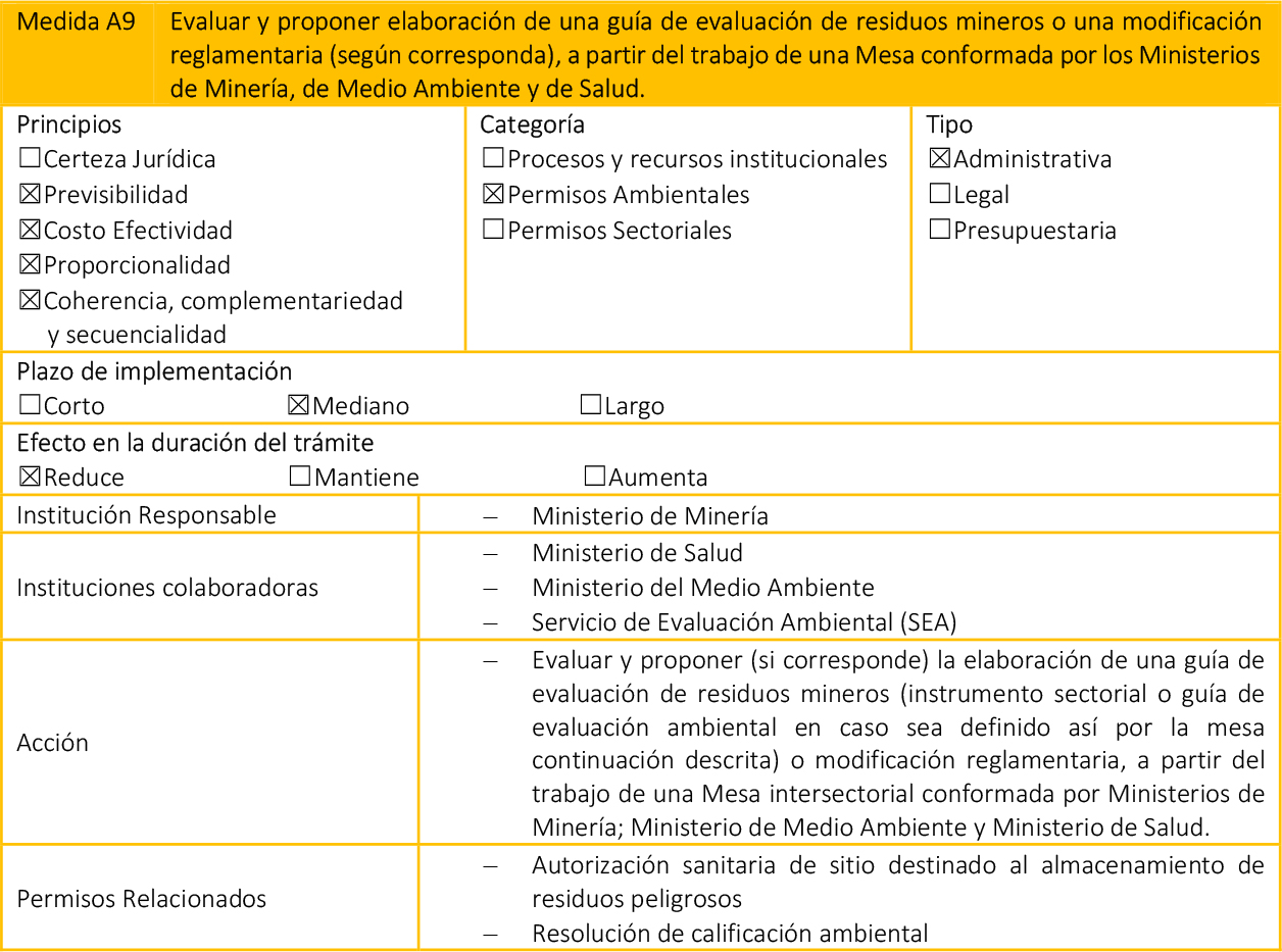 - Medidas Presupuestarias: Corresponden a medidas que, si bien se pueden clasificar en las dos categorías anteriores, para su correcta implementación requieren recursos adicionales en el presupuesto de la(s) institución(es) correspondiente(s).