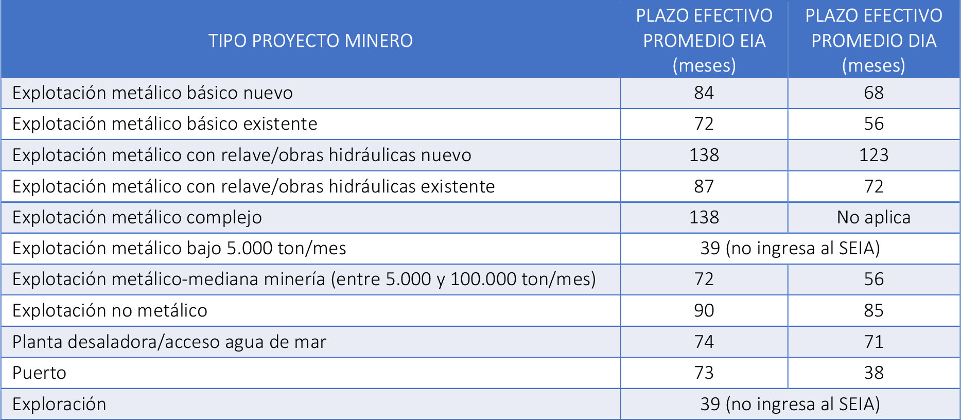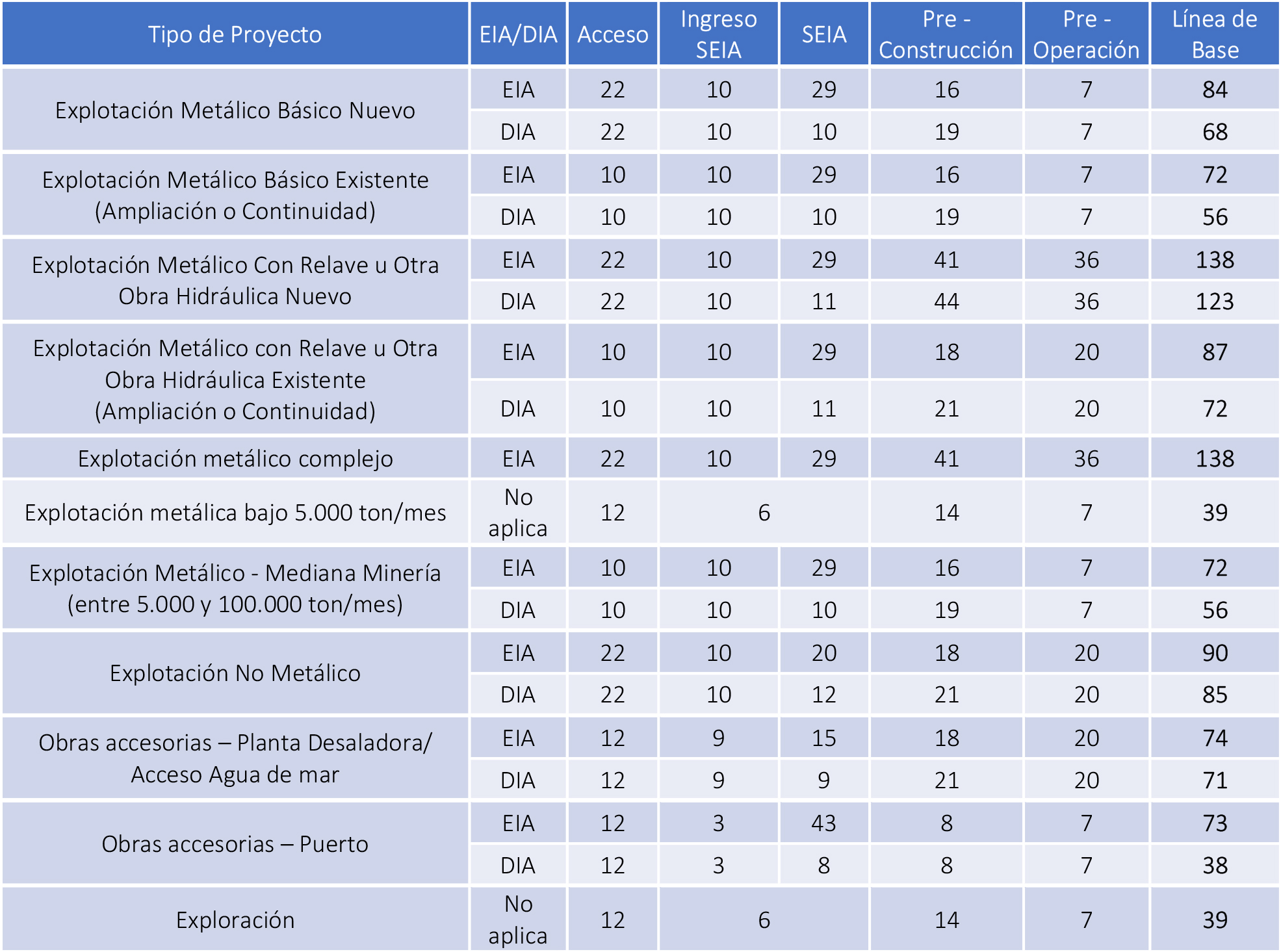 - Los plazos para el SEIA se obtuvieron de promedios de los proyectos analizados en esta tipología particular para el caso de la DIA (8 meses) y EIA (43 meses).