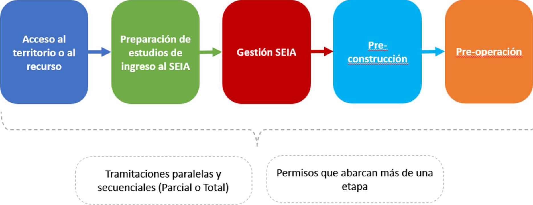 Existen algunos permisos que se tramitan a lo largo de diversas etapas, por lo que su aporte al plazo total de tramitación se hace tomando en consideración dicha variable. Es el caso de los permisos sectoriales que se tramitan en la etapa Pre-Construcción, cuya tramitación se inicia antes de obtenida la RCA que finaliza la etapa de tramitación ante el SEIA.