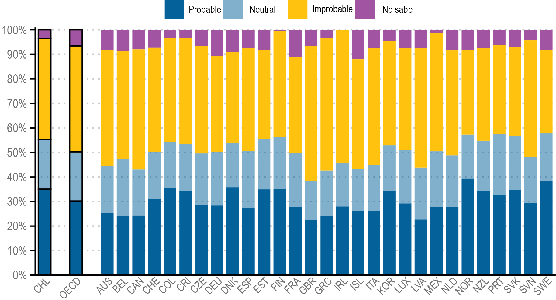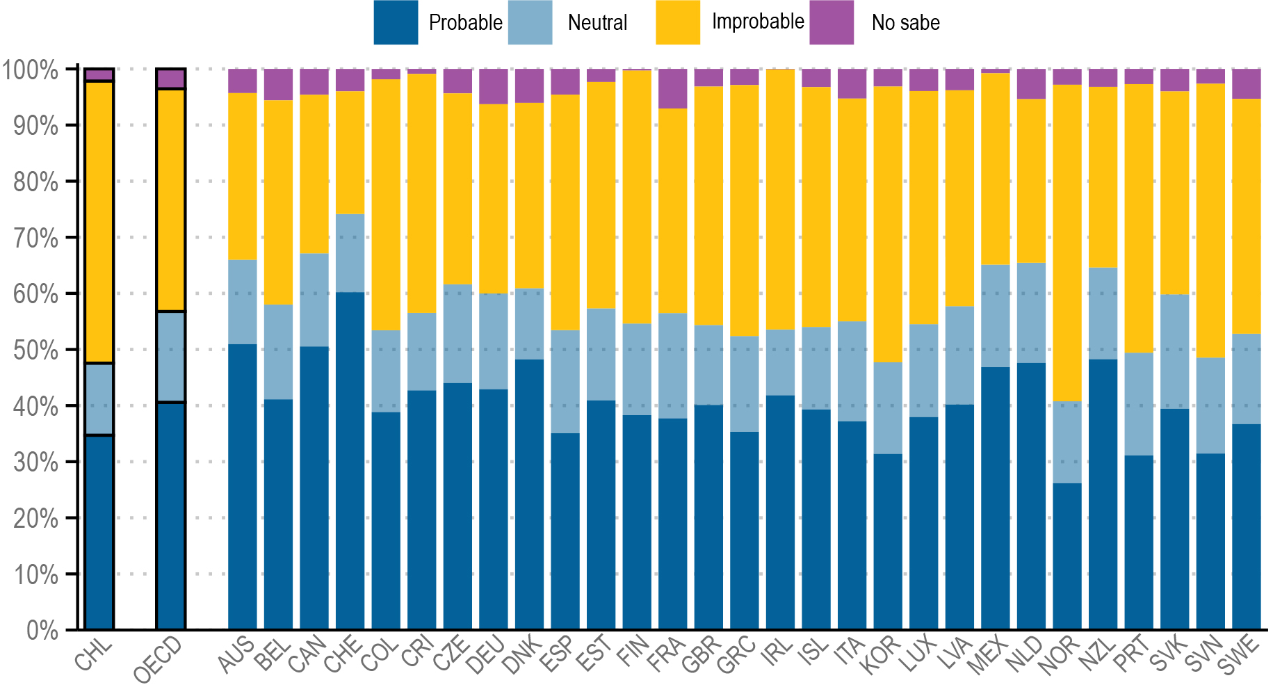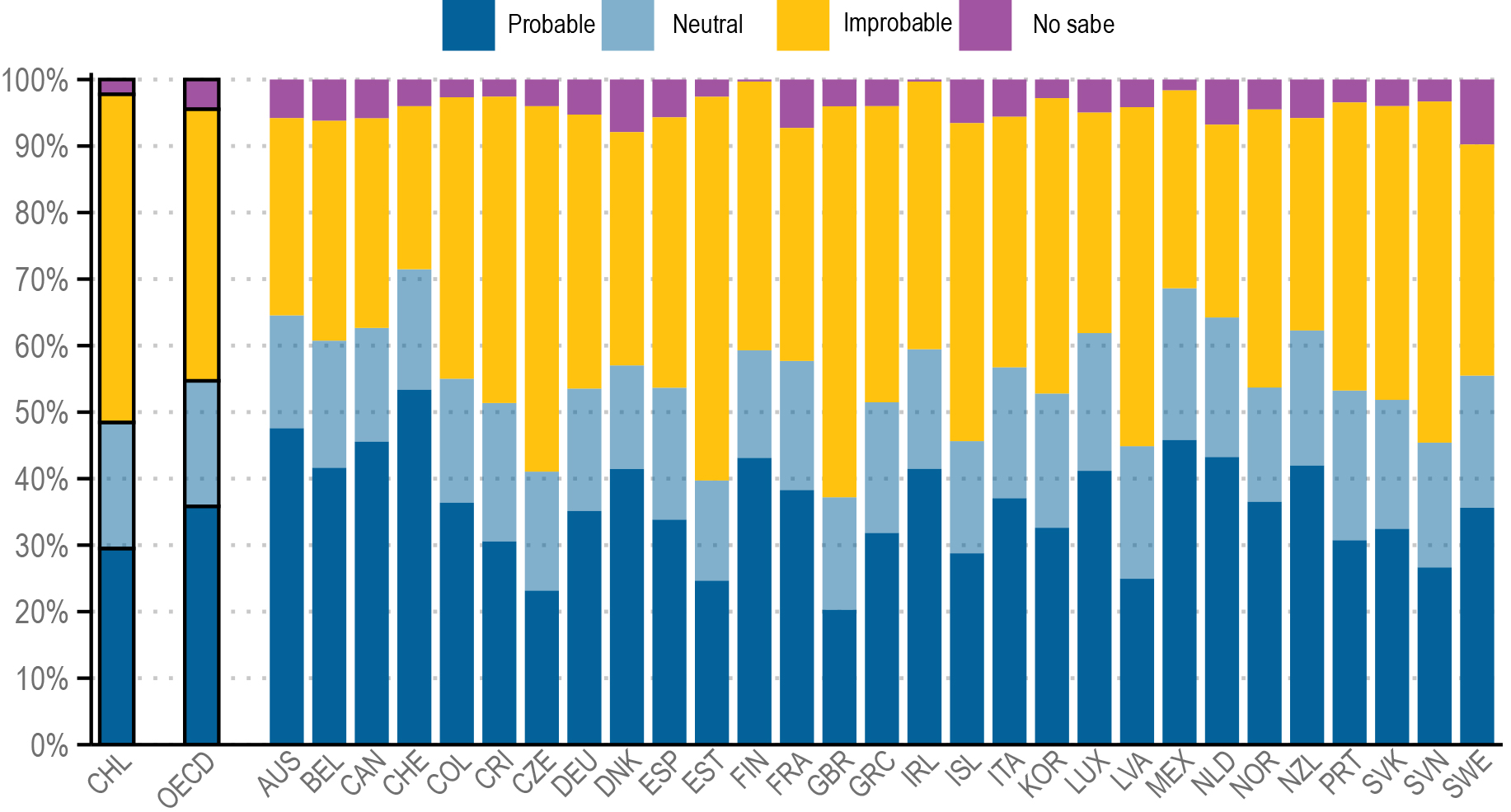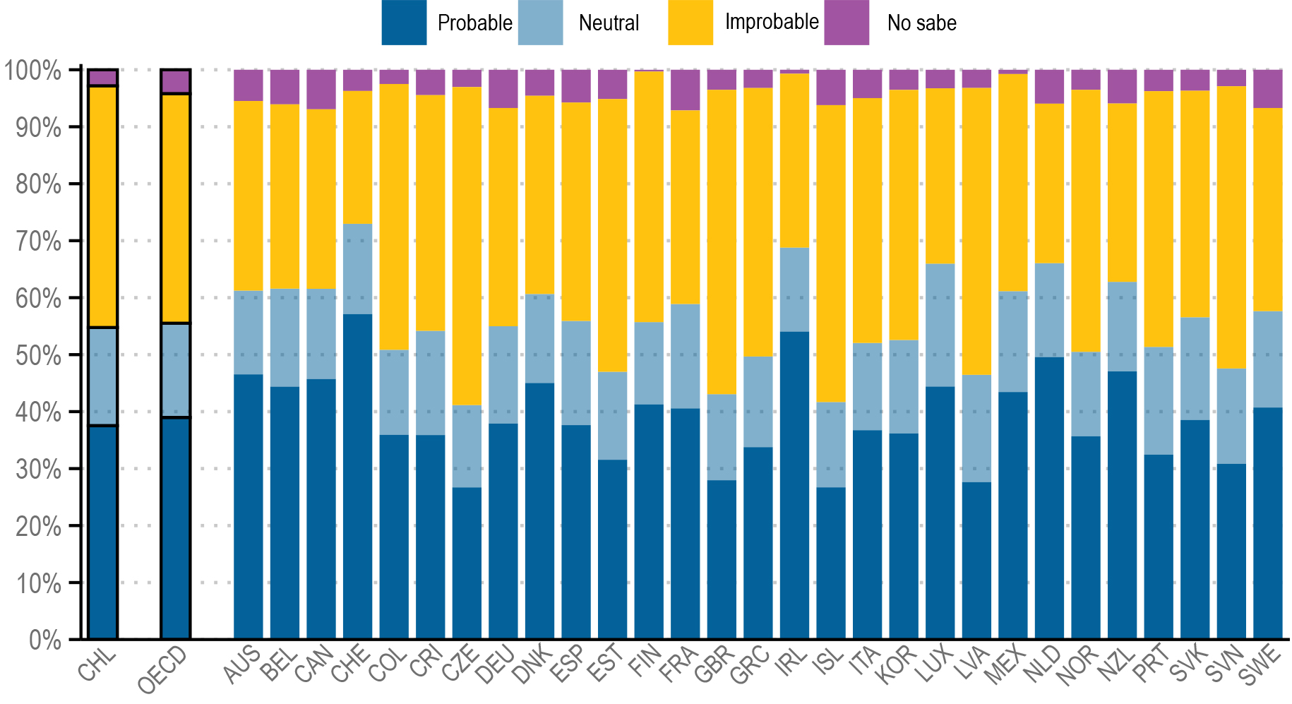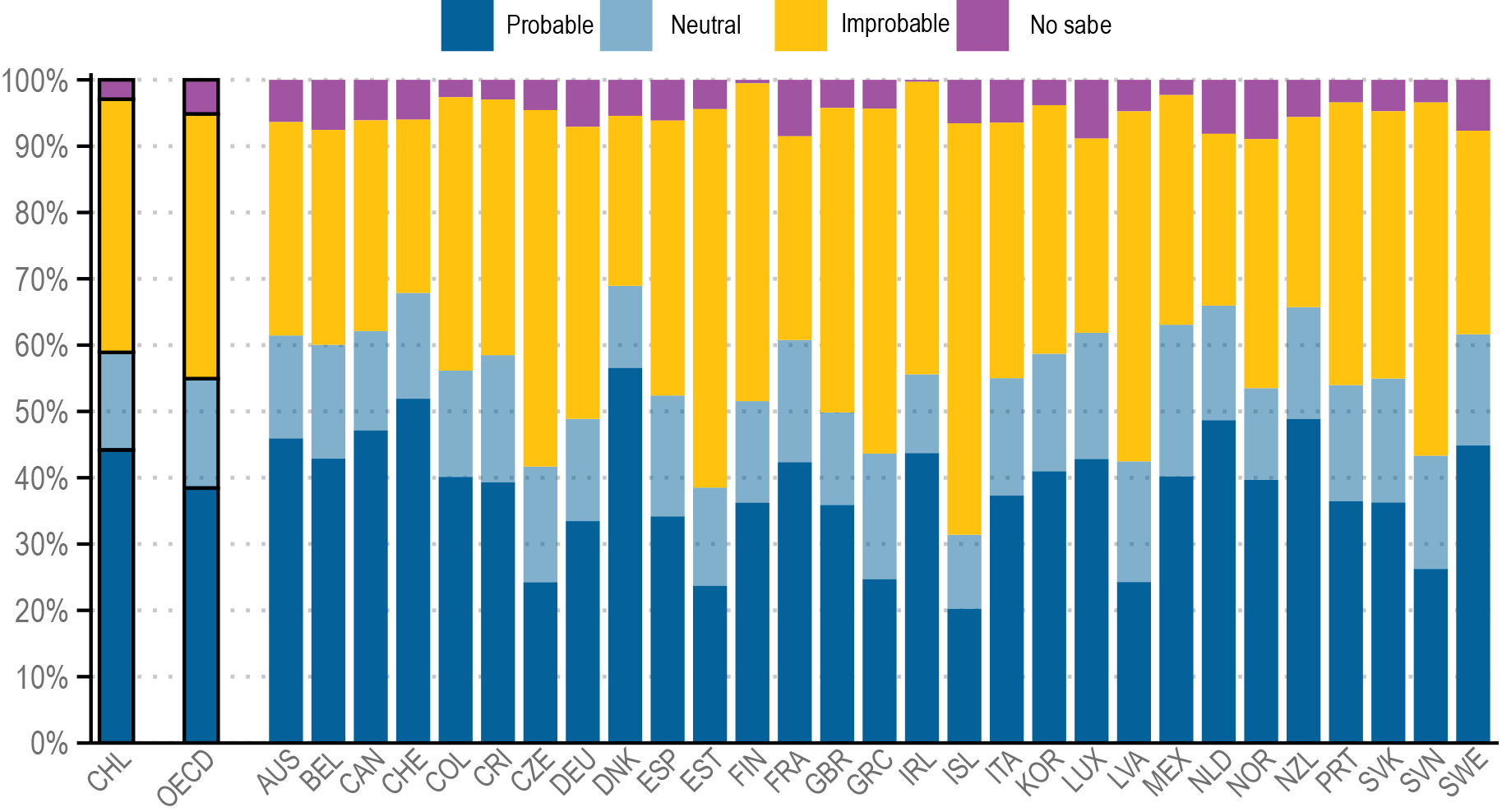 Nota: La figura muestra las distribuciones dentro del país de las respuestas a la pregunta: "Si el gobierno nacional estuviera llevando a cabo una reforma, ¿qué tan probable cree que es que explicaría claramente cómo le afectará la reforma?". La proporción de "probable" es la agregación de respuestas de 6 a 10 en la escala; "neutral" equivale a una respuesta de 5; "improbable" es la agregación de respuestas de 1 a 4; y "no sabe" fue una opción de respuesta separada. El "promedio de la OCDE" presenta el promedio no ponderado de las respuestas entre los países.