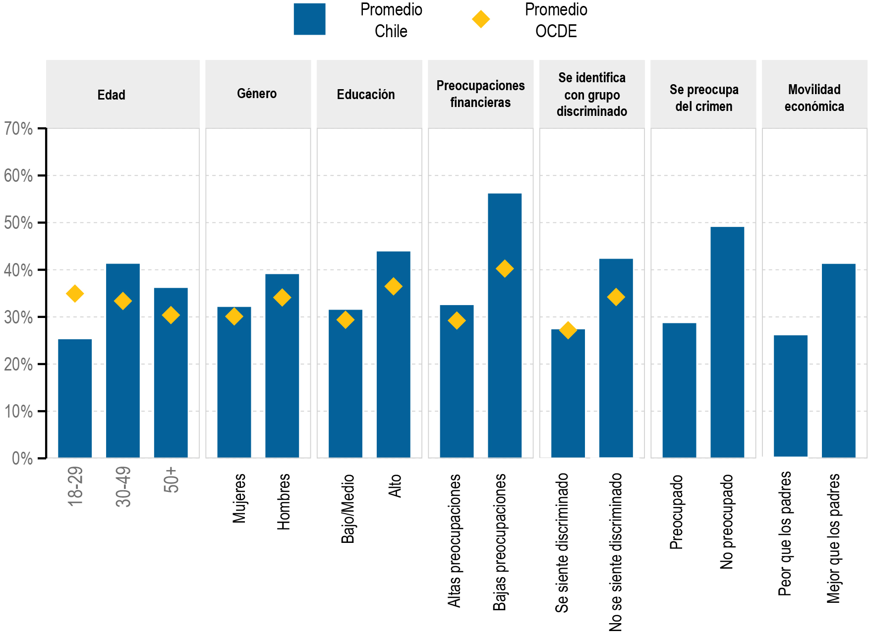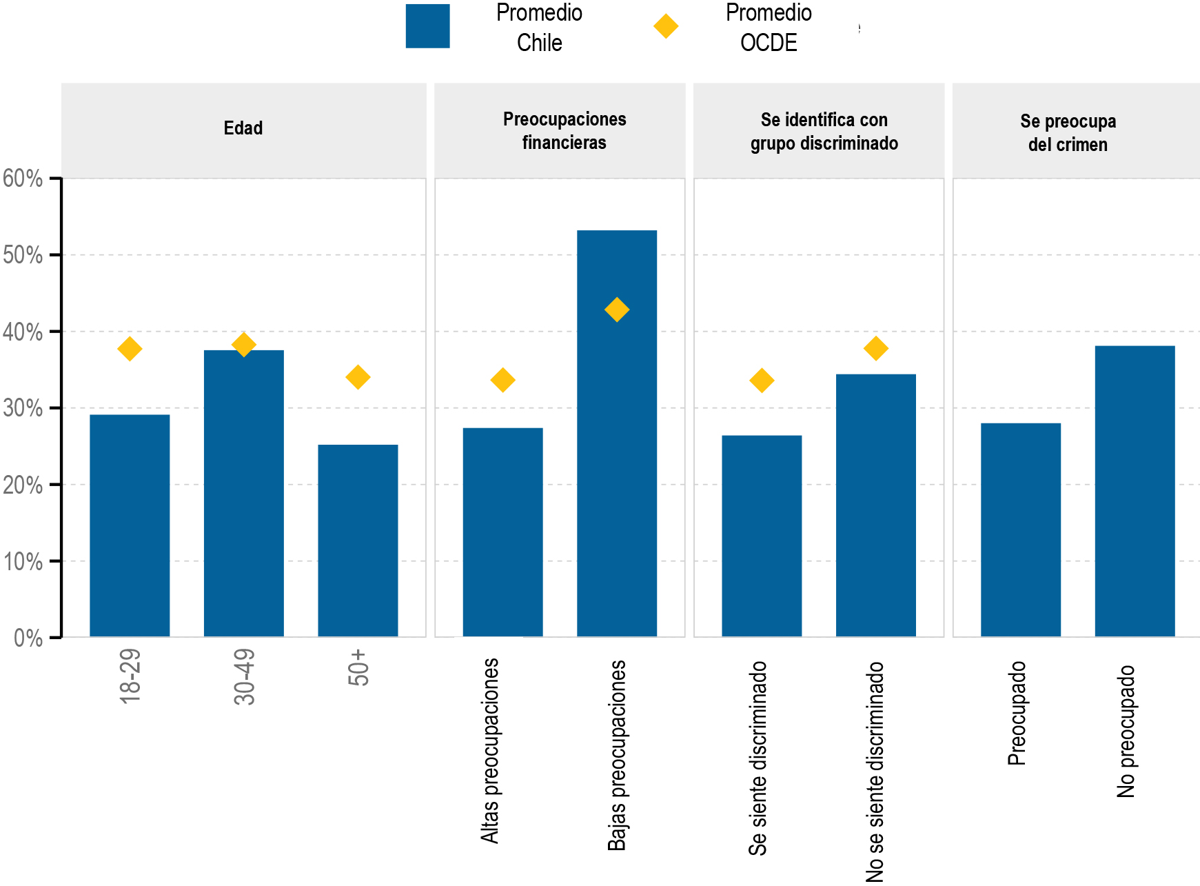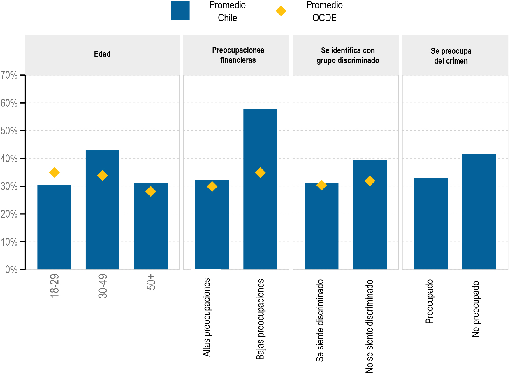 Nota: La figura presenta los promedios ponderados para Chile y los promedios no ponderados entre los países de la OCDE de las respuestas a la pregunta: "Si el parlamento o congreso nacional debatiera una nueva política, ¿qué tan probable cree que es que equilibraría adecuadamente las necesidades de diferentes regiones y grupos de la sociedad?", según las características demográficas de los encuestados (edad), el contexto socioeconómico (preocupaciones financieras, identificación como parte de un grupo discriminado, movilidad económica) y preocupaciones sobre el crimen. Aquí se muestra la proporción de encuestados que respondieron que es "probable" (respuestas de 6 a 10 en una escala de 0 a 10). Las preocupaciones financieras se miden preguntando: "En general, pensando en el próximo año o dos, ¿qué tan preocupado está por las finanzas de su hogar y su bienestar social y económico en general?", y agregando las respuestas 3 (algo preocupado) y 4 (muy preocupado). Las preocupaciones sobre el crimen se miden preguntando: "¿Con qué frecuencia, si es que alguna vez, le preocupa ser víctima de un crimen violento en [país]?", y agregando las respuestas 1 (siempre) y 2 (ocasionalmente). La movilidad económica se mide preguntando: "Pensando en su situación económica actual y en sus perspectivas futuras, ¿cree que le irá mejor, peor o más o menos igual que a sus padres?", y agregando las respuestas 1 (Creo que me irá mucho mejor que a mis padres) y 2 (Creo que me irá un poco mejor que a mis padres). Todas las variables representadas son estadísticamente significativas a p<*** 0,01. * p<0,1; ** p<0,05; *** 0,01. El grupo de referencia para la edad es "18-29", para preocupaciones financieras: "Altas preocupaciones", para quienes se identifican con un grupo discriminado: "Se sienten discriminados", para preocupación por el crimen: "Preocupado", y para movilidad económica: "Peor que los padres".