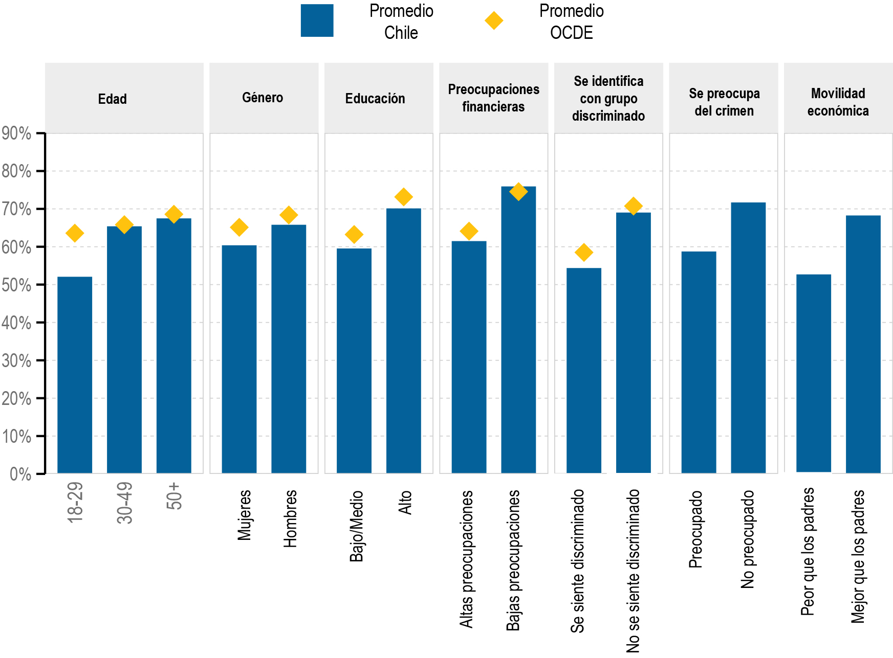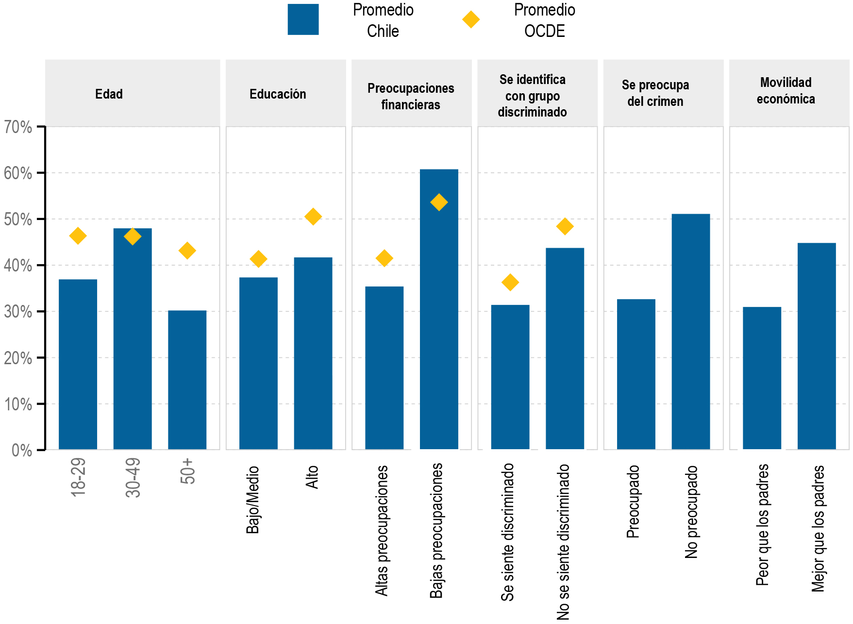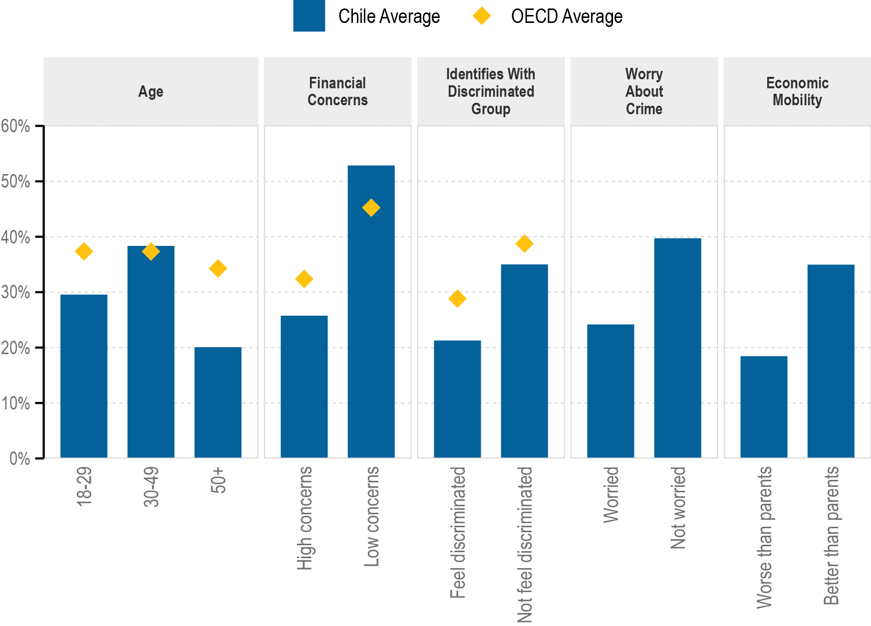 Nota: La figura presenta los promedios ponderados para Chile y los promedios no ponderados entre los países de la OCDE de las respuestas a la pregunta: "Si el parlamento o congreso nacional debatiera una nueva política, ¿qué tan probable cree que es que equilibraría adecuadamente las necesidades de diferentes regiones y grupos de la sociedad?", según las características demográficas de los encuestados (edad), el contexto socioeconómico (preocupaciones financieras, identificación como parte de un grupo discriminado, movilidad económica) y preocupaciones sobre el crimen. Aquí se muestra la proporción de encuestados que respondieron que es "probable" (respuestas de 6 a 10 en una escala de 0 a 10). Las preocupaciones financieras se miden preguntando: "En general, pensando en el próximo año o dos, ¿qué tan preocupado está por las finanzas de su hogar y su bienestar social y económico en general?", y agregando las respuestas 3 (algo preocupado) y 4 (muy preocupado). Las preocupaciones sobre el crimen se miden preguntando: "¿Con qué frecuencia, si es que alguna vez, le preocupa ser víctima de un crimen violento en [país]?", y agregando las respuestas 1 (siempre) y 2 (ocasionalmente). La movilidad económica se mide preguntando: "Pensando en su situación económica actual y en sus perspectivas futuras, ¿cree que le irá mejor, peor o más o menos igual que a sus padres?", y agregando las respuestas 1 (Creo que me irá mucho mejor que a mis padres) y 2 (Creo que me irá un poco mejor que a mis padres). Todas las variables representadas son estadísticamente significativas a p<*** 0,01. * p<0,1; ** p<0,05; *** 0,01. El grupo de referencia para la edad es "18-29", para preocupaciones financieras: "Altas preocupaciones", para quienes se identifican con un grupo discriminado: "Se sienten discriminados", para preocupación por el crimen: "Preocupado", y para movilidad económica: "Peor que los padres".