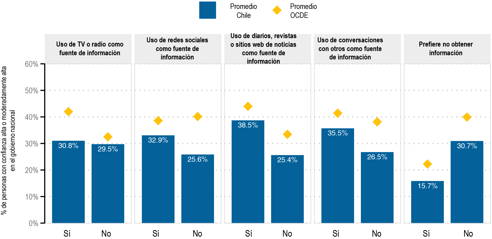 Nota: La figura presenta la proporción de personas con confianza alta o moderadamente alta en el gobierno nacional, dependiendo de los medios o fuentes de información sobre política y asuntos actuales en un día típico. La proporción con confianza alta o moderadamente alta corresponde a encuestados que seleccionan una respuesta de 6 a 10 a la pregunta: "En una escala de 0 a 10, donde 0 es nada y 10 es completamente, ¿cuánto confía en el gobierno nacional?". Si el encuestado usa o no la fuente de información seleccionada se deriva de su respuesta(s) a la pregunta: "En un día típico, ¿de cuáles de las siguientes fuentes, si las hay, obtiene información sobre política y asuntos actuales?", para la cual pueden seleccionar todas las opciones que correspondan. La figura muestra los promedios ponderados de Chile y los promedios no ponderados de la OCDE.
