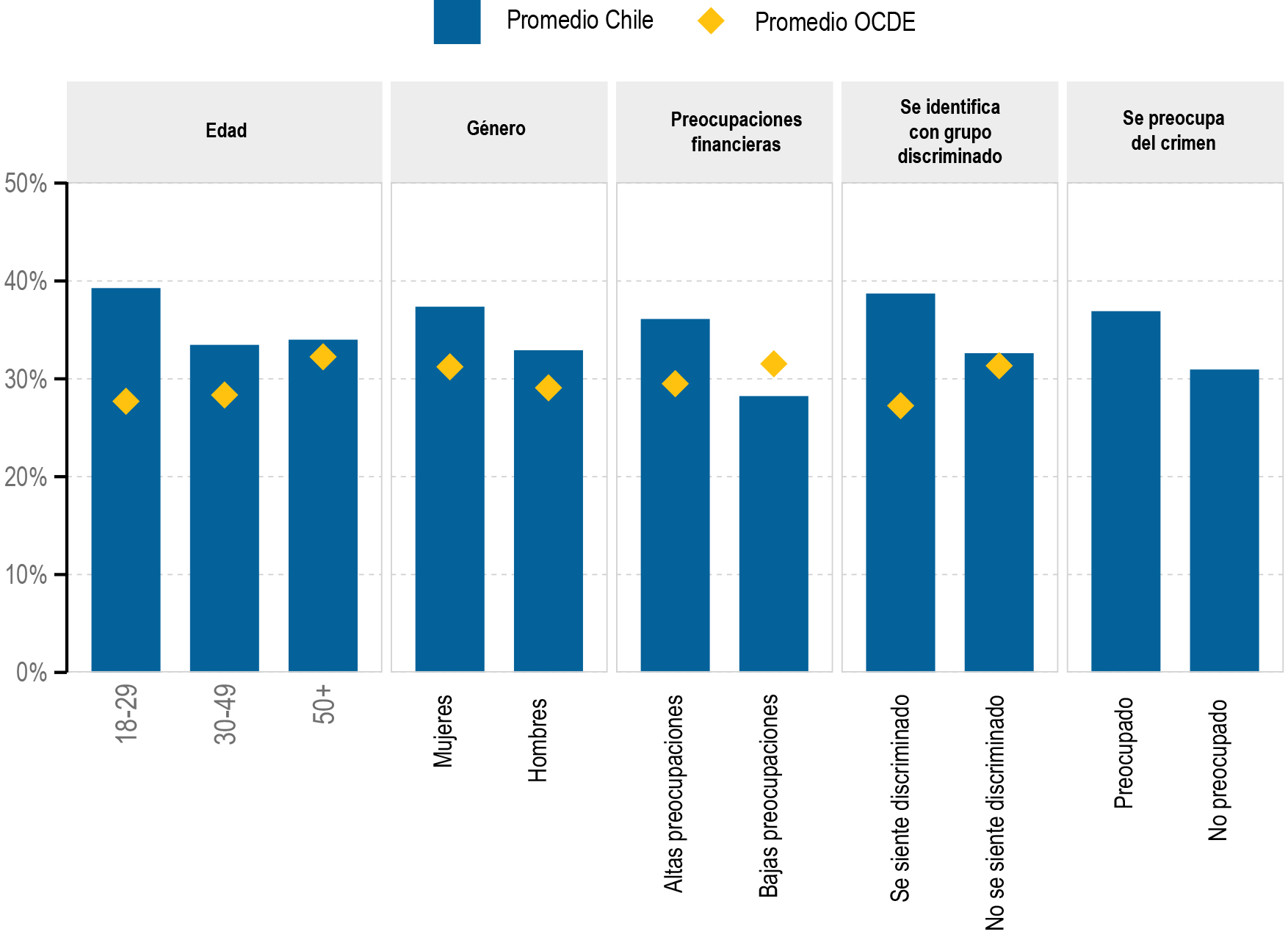 Los resultados anteriores también sugieren una brecha entre las percepciones de la población a nivel personal —con respecto a su papel en el sistema— y aquellas a nivel sistémico —sobre el sistema mismo—. Muchas personas se sienten capaces de participar en la vida pública, pero muy pocas se sienten capaces de influir en la política. Aunque muchas informan participar en consultas públicas, muy pocas sienten que sus voces son escuchadas. En línea con estos resultados, una gran mayoría de la población (84%) cree que la ciudadanía debería votar directamente sobre temas específicos, mientras que es bastante escéptica sobre las instituciones de la democracia representativa y la acción colectiva. El apoyo de la gente en Chile a los mecanismos de democracia directa está ligeramente por encima del promedio de los países de la OCDE (79%).