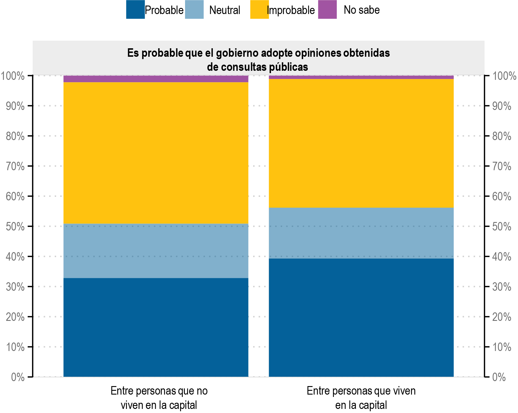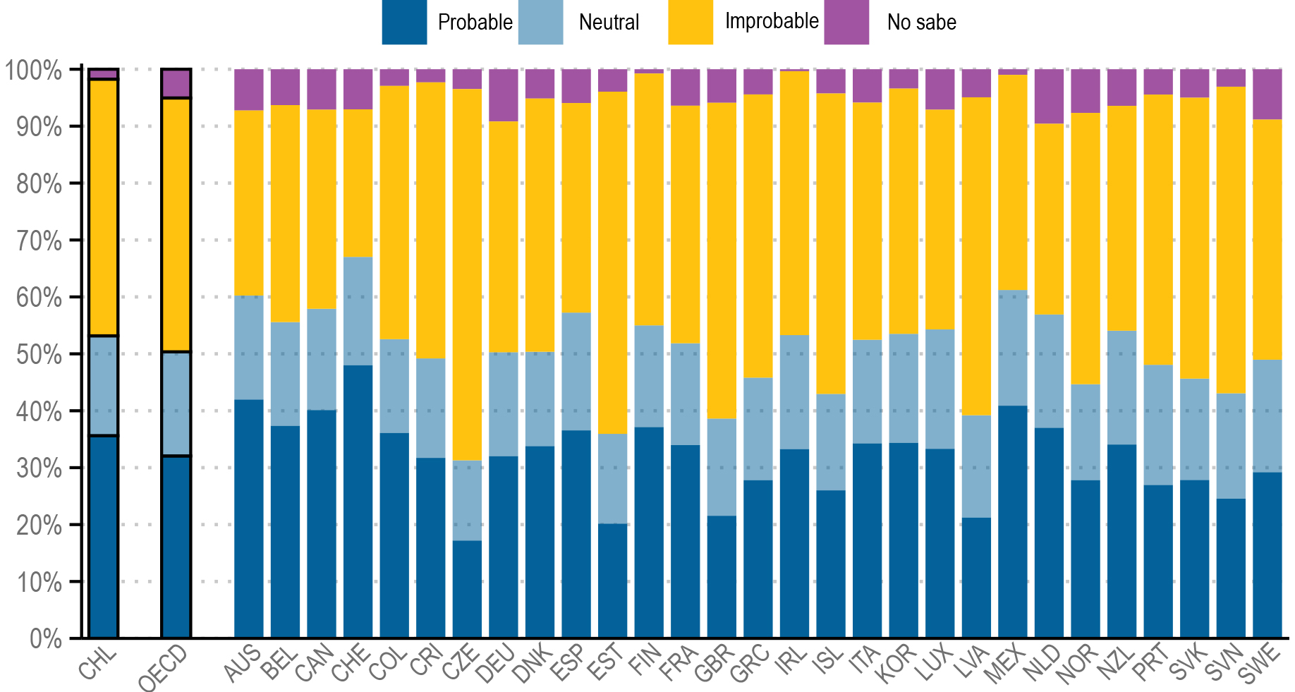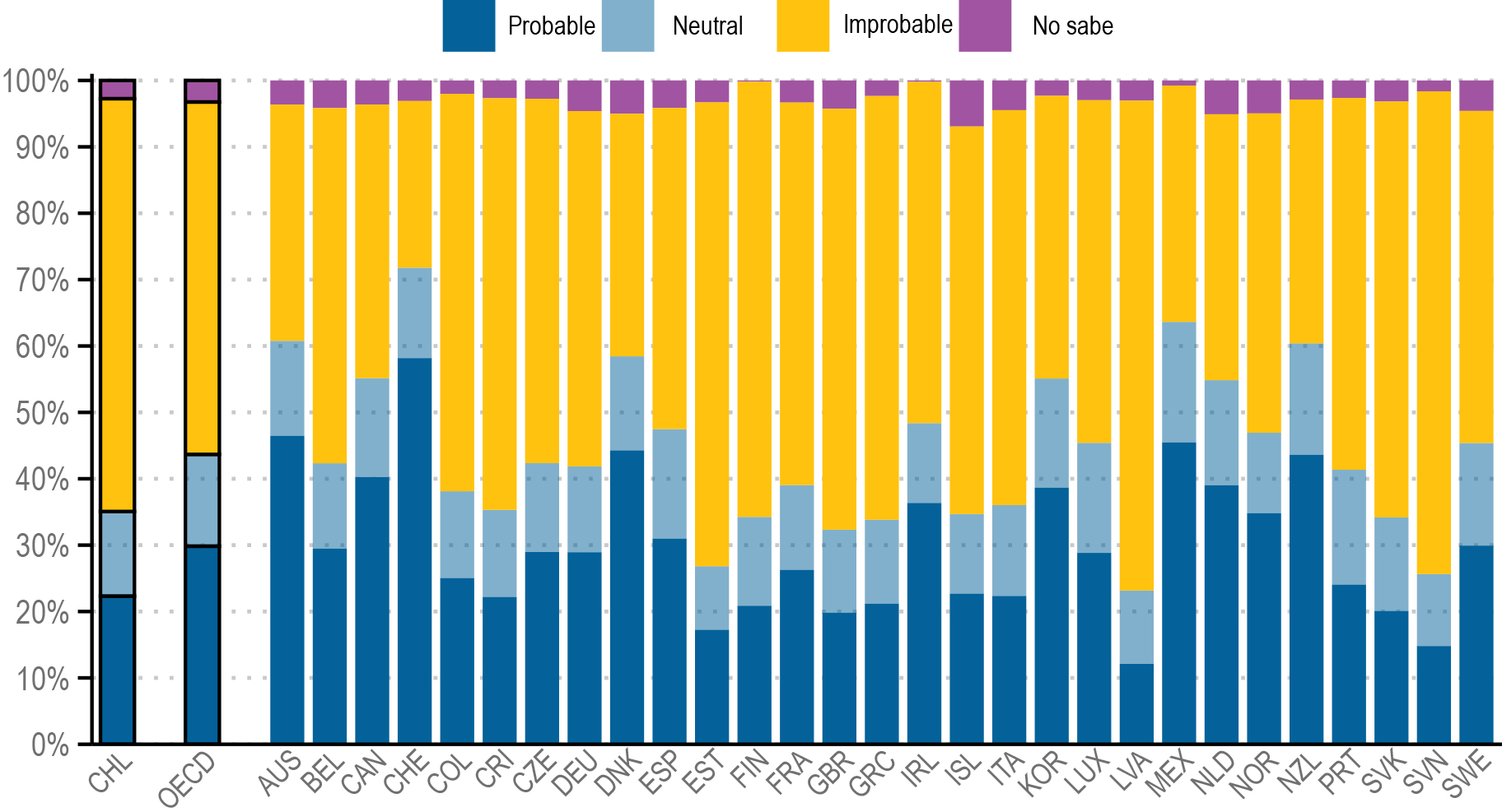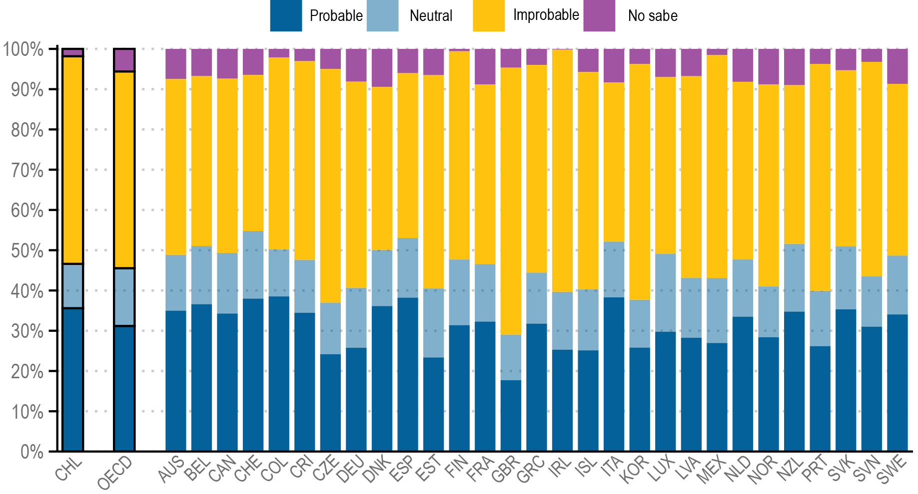 Nota: La figura muestra las distribuciones dentro del país de las respuestas a la pregunta "Si usted participara en una consulta pública sobre la reforma de un área de política, ¿qué tan probable cree que es que el gobierno adopte las opiniones expresadas en la consulta?". La proporción "probable" corresponde a la agregación de respuestas de 6 a 10 en la escala; "neutral" equivale a una respuesta de 5; "improbable" es la agregación de respuestas de 1 a 4; y "no sabe" fue una opción de respuesta separada. "OCDE" presenta el promedio no ponderado de las respuestas entre los países.