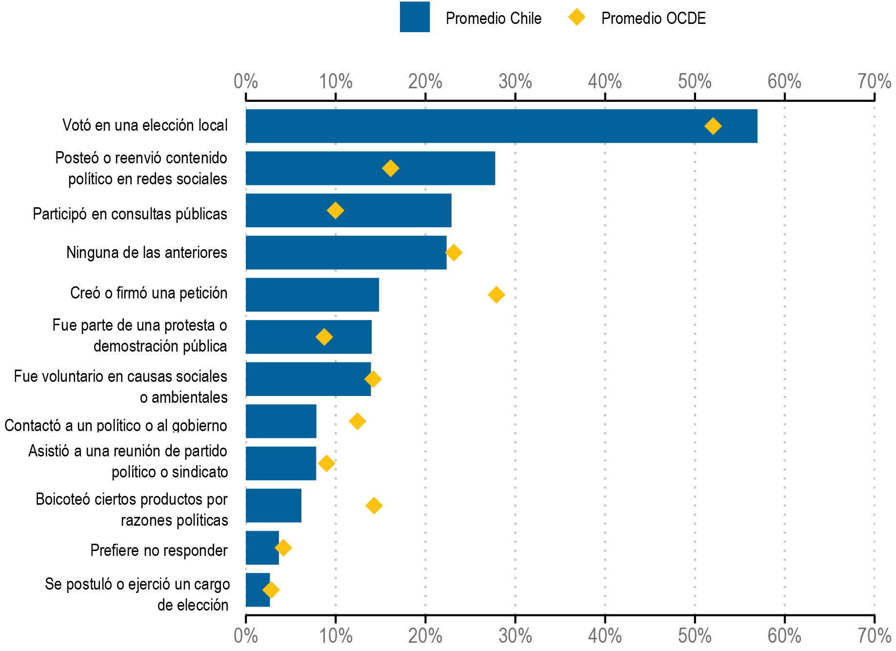 Proporción de la población en Chile y promedio de la OCDE que participó en diversas actividades políticas, 2023