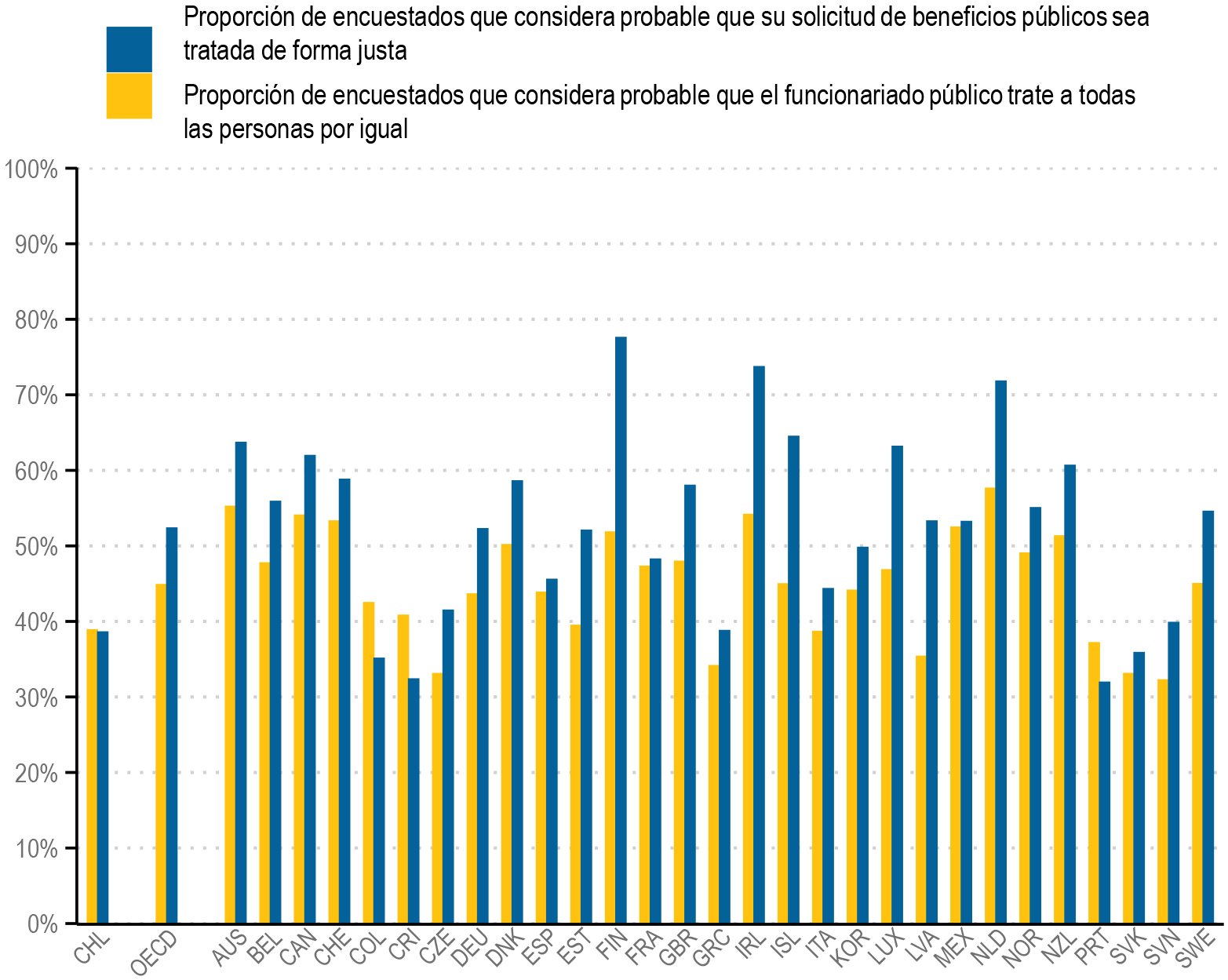 Nota: La figura muestra las distribuciones dentro de cada país de la proporción que responde que es "probable" (respuestas de 6 a 10 en una escala de 0 a 10) a las preguntas: "Si un empleado público interactuara con el público en el área donde usted vive, ¿qué tan probable cree que es que trataría a todas las personas por igual, independientemente de su nivel de ingresos, identidad de género, orientación sexual, etnia o país de origen?" (azul) y "Si usted o un miembro de su hogar solicitara un beneficio o servicio del gobierno, ¿qué tan probable cree que es que su solicitud fuese tratada de manera justa?" (amarillo).