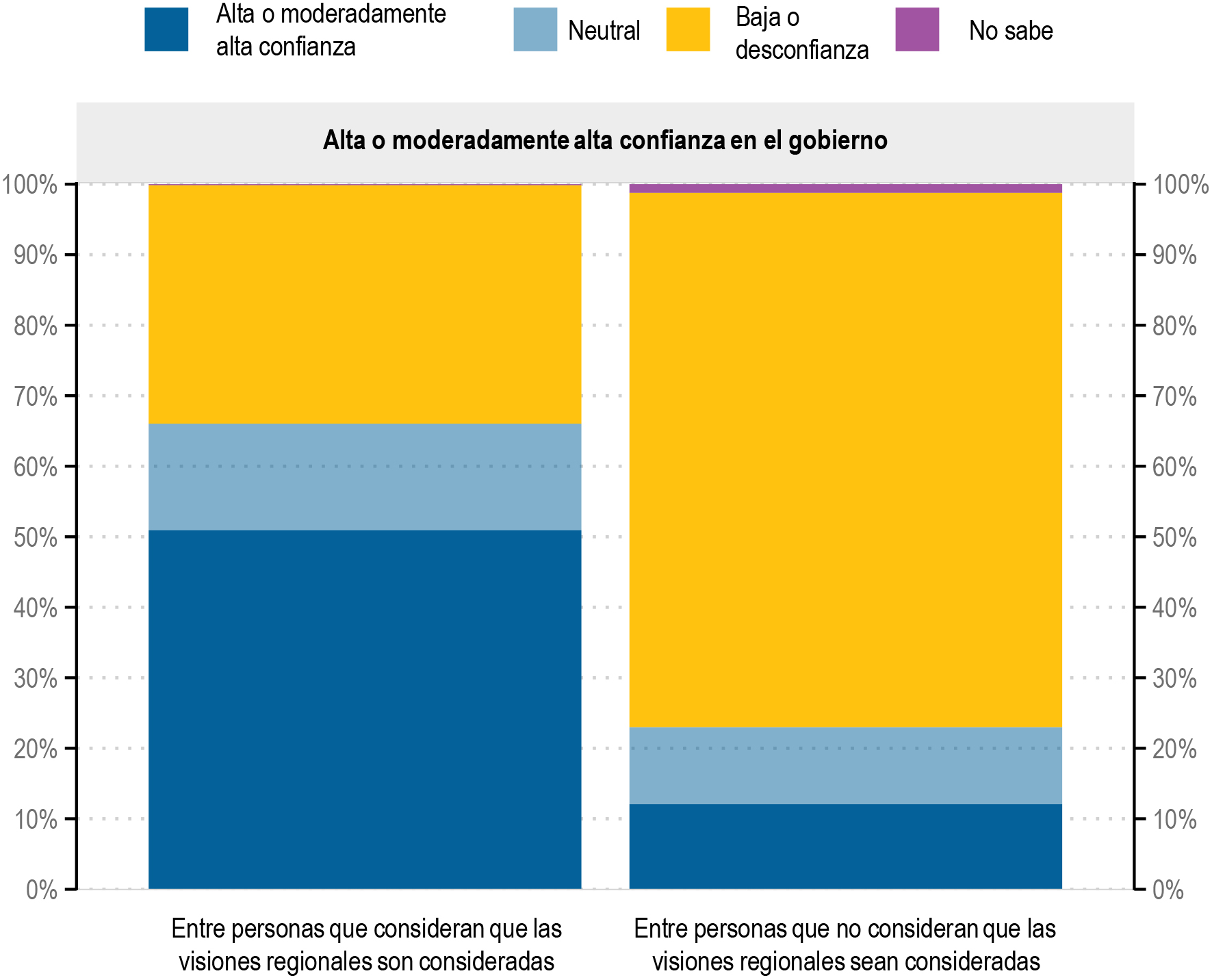 Nota: La figura muestra las distribuciones dentro del país de las respuestas a la pregunta "¿En qué medida diría usted que el sistema político en [país] permite que personas como usted tengan voz en lo que hace el gobierno?". La proporción "alta o moderadamente alta" corresponde a la agregación de respuestas de 6 a 10 en la escala; "neutral" equivale a una respuesta de 5; "baja o sin confianza" es la agregación de respuestas de 1 a 4; y "no sabe" fue una opción de respuesta separada. "OCDE" presenta el promedio no ponderado de las respuestas entre los países.