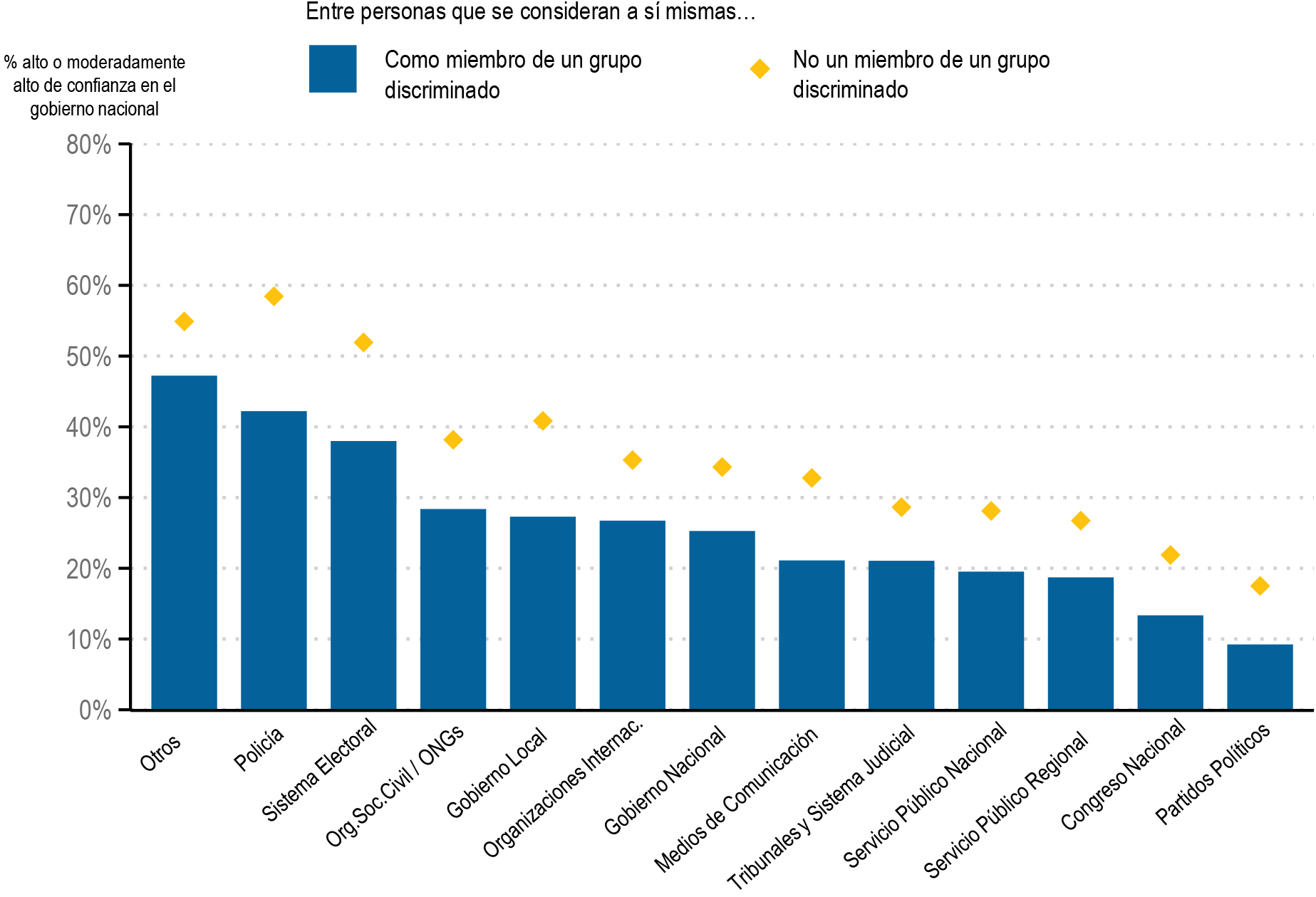 Nota: La figura presenta el promedio ponderado de Chile de las respuestas a la pregunta: "En una escala de 0 a 10, donde 0 es nada y 10 es completamente, ¿cuánta confianza tiene en el gobierno nacional?". La figura muestra la proporción de encuestados que tienen "confianza alta o moderadamente alta", basada en la agregación de respuestas de 6 a 10 en la escala de 0 a 10, agrupados por si las personas se consideran miembros de un grupo discriminado o no.