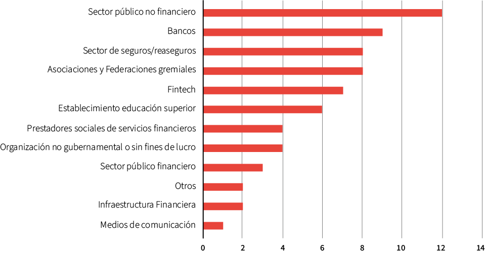 Esta distribución evidencia que, aunque existe una fuerte representación del sector público y de actores tradicionales como bancos y aseguradoras, también se incorporan actores emergentes como fintech y organizaciones sociales, lo que enriquece la diversidad de perspectivas en materia de educación financiera.