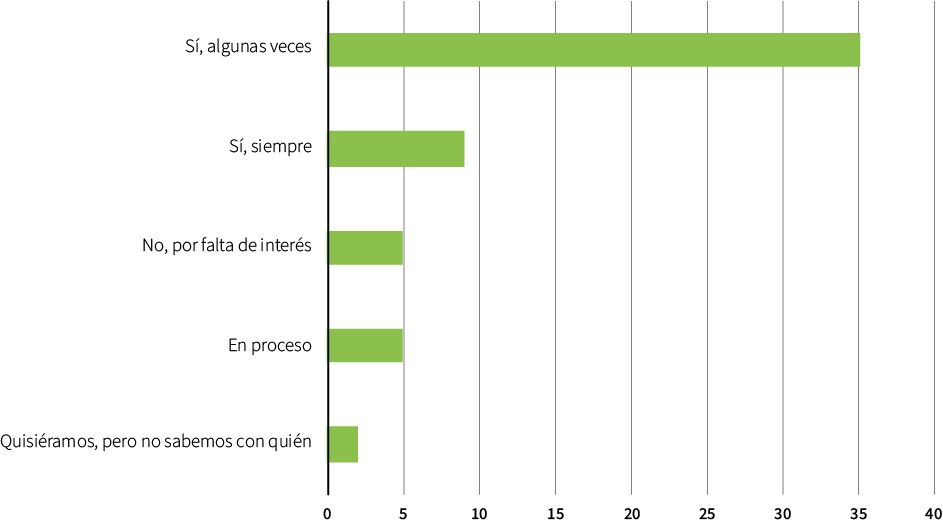 Por otro lado, un 9% (5 entidades) no establece alianzas por falta de interés, otro 9% (5 entidades) está en proceso de establecerlas y un 4% (2 entidades) quisiera, pero no sabe con quién (gráfico 10.1).