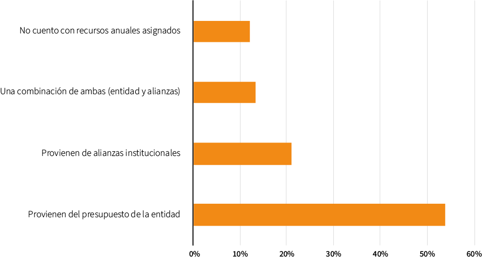 El origen de los recursos para la implementación de los programas e iniciativas de EF se concentra en el presupuesto propio, utilizado por un 54% de las entidades. Un 21% reporta apoyo a través de alianzas, un 13% combina fondos internos y externos y un 12% indica no contar con una asignación anual. En síntesis, el presupuesto institucional constituye la base principal, mientras que las alianzas operan como complemento para ampliar el alcance (gráfico 12.1).