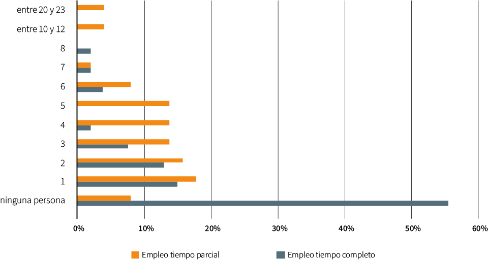 En cuanto al personal a tiempo parcial, la situación se invierte: solo un 8% declara no tener personas asignadas, y lo más común es operar con 1-5 colaboradores. También existen experiencias con equipos más grandes (6-8 personas), e incluso algunos que alcanzan entre los 10 y 23 integrantes (gráfico 12.4).