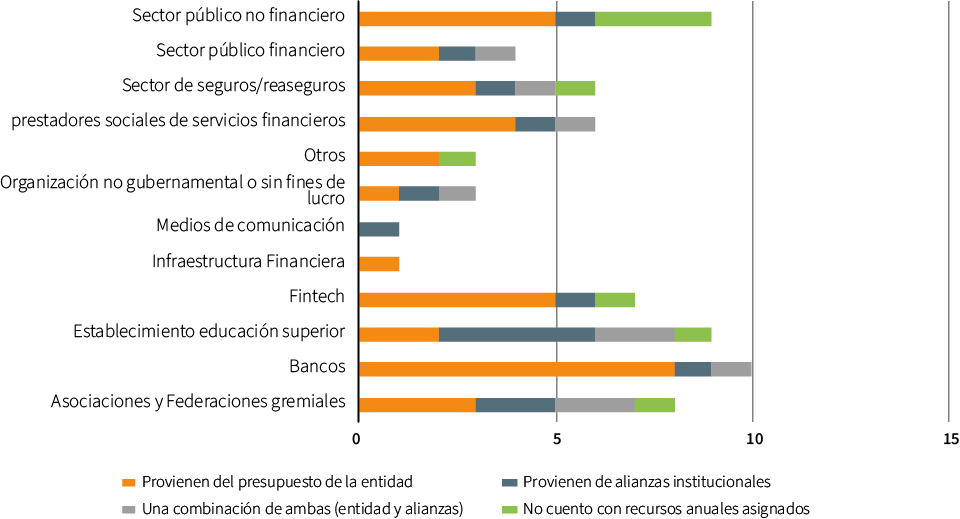 La ausencia de una asignación anual destaca principalmente en el sector público no financiero (3 entidades) y, en menor medida, en educación superior, fintech, seguros y prestadores sociales (1 entidad cada uno) (gráfico 12.2).