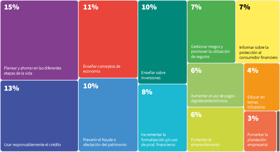 - Sector público no financiero: destaca en planificación y ahorro, crédito responsable, enseñanza de economía e inversiones (15% cada uno). También aborda prevención de fraude (10%), entre otros.