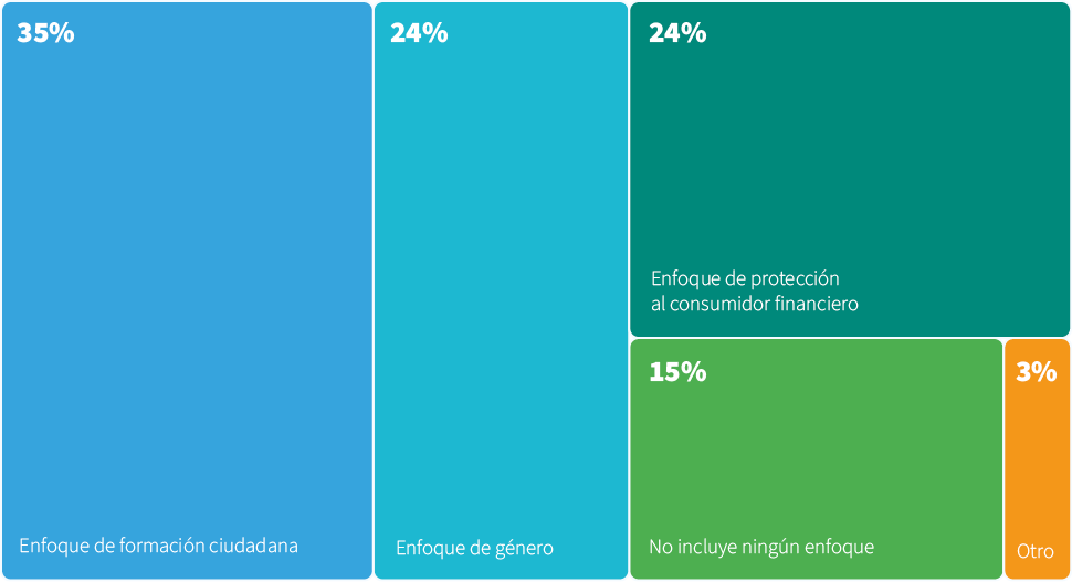 La mayoría de las entidades incorpora algún enfoque transversal (85%). Predomina formación ciudadana (35%); le siguen género (24%) y protección al consumidor financiero (24%), que en conjunto alcanzan 48%. Un 15% no declara enfoque y un 3% reporta “otros”. Este último agrupa ajustes para públicos o contextos específicos -más que categorías nuevas- y refuerza la adaptación territorial, inclusiva y digital (gráfico 6.1).