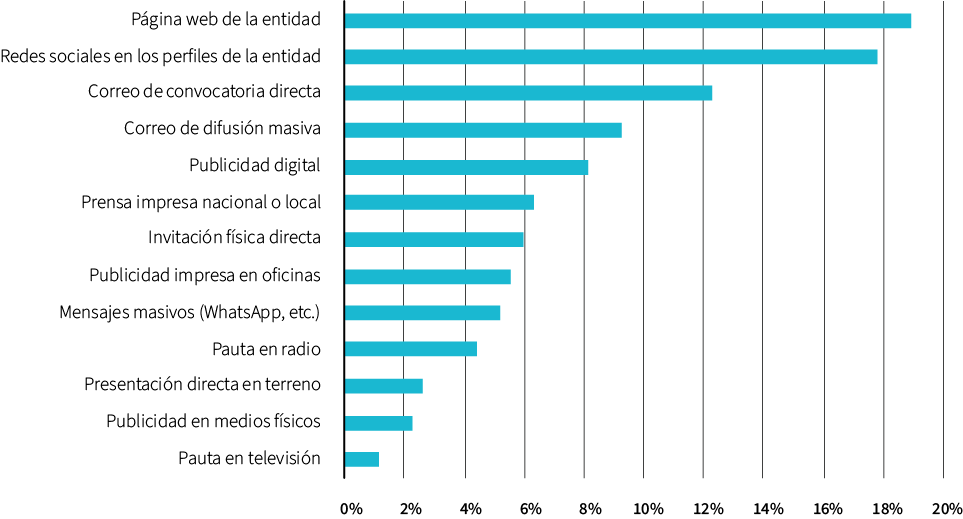 En cuanto a los canales que utilizan las entidades para divulgar información sobre el lanzamiento o desarrollo de programas e iniciativas de EF, se observa que la difusión se concentra principalmente en las páginas web institucionales (19%) y en redes sociales propias (18%). En segundo lugar aparecen los correos electrónicos, ya sea para convocatoria directa (12%) o para difusión masiva (9%). Entre los medios destaca la publicidad digital (8%), seguida por la prensa impresa nacional o local (6%) y el material impreso en oficinas (6%); en menor medida se utilizan radio (4%) y televisión (1%). Como complemento, se emplean mensajes masivos por WhatsApp (5%), invitaciones físicas (6%) y presentaciones directas en terreno (3%) (gráfico 7.1).