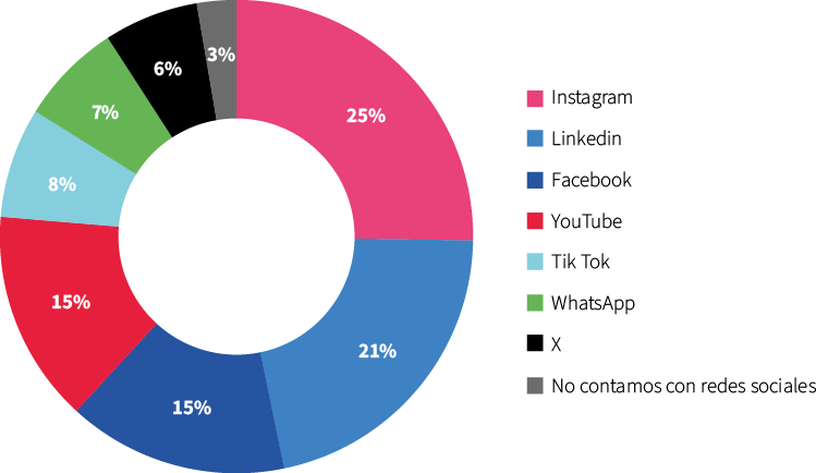 Instagram y LinkedIn lideran la combinación de canales; Facebook y YouTube complementan; mientras que TikTok, WhatsApp y X tienen menor presencia.