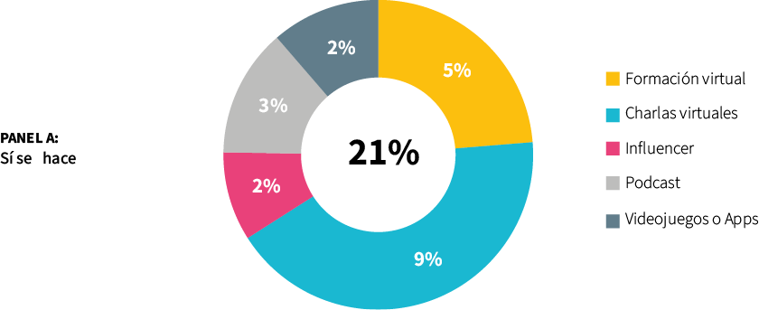 Entre las modalidades tecnológicas ya en uso, predominan las charlas virtuales (9%) y la formación virtual (5%); con menor presencia aparecen influencers (2%), podcasts (3%) y videojuegos o apps (2%) (gráfico 7.3, panel A).