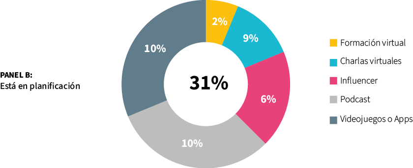 En cuanto a lo planificado, se proyecta un giro hacia formatos de mayor alcance y on-demand: podcasts (10%) y videojuegos o apps (10%) lideran, seguidos por influencers (6%), charlas virtuales (9%) y formación virtual (2%) (gráfico 7.3, panel B).