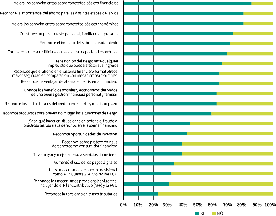 Respecto a los beneficios que las entidades han podido identificar, los resultados muestran que los más extendidos son de tipo cognitivo y de habilidades básicas, tales como mejorar los conocimientos financieros (86%), reconocer la importancia del ahorro (80%), comprender conceptos económicos (80%), elaborar presupuestos (73%), entender el sobreendeudamiento (71%) y tomar decisiones de crédito según capacidad de pago (70%) (gráfico 8.1).