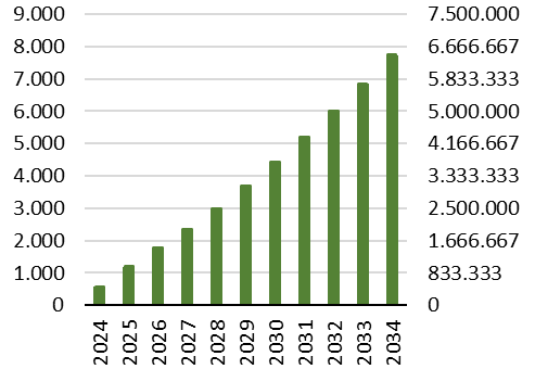 (millones de dólares de 2024 -eje izq., millones de pesos 2024 -eje der.)