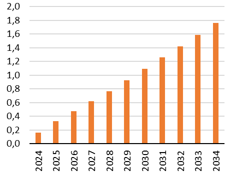 Finalmente, si la tasa de crecimiento del PIB fuera de un punto porcentual adicional anual respecto de la proyección base por los próximos 10 años, se generaría holguras fiscales adicionales de 0,16% del PIB en 2024 y crecerían hasta llegar a 1,76% en 203423 (aproximadamente US $7.800 millones o $6.500 millones en dicho año, Gráfico III.2).