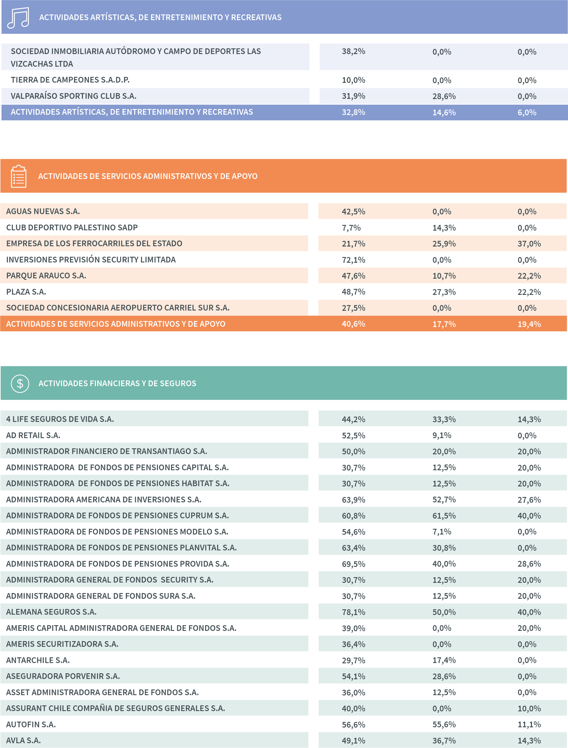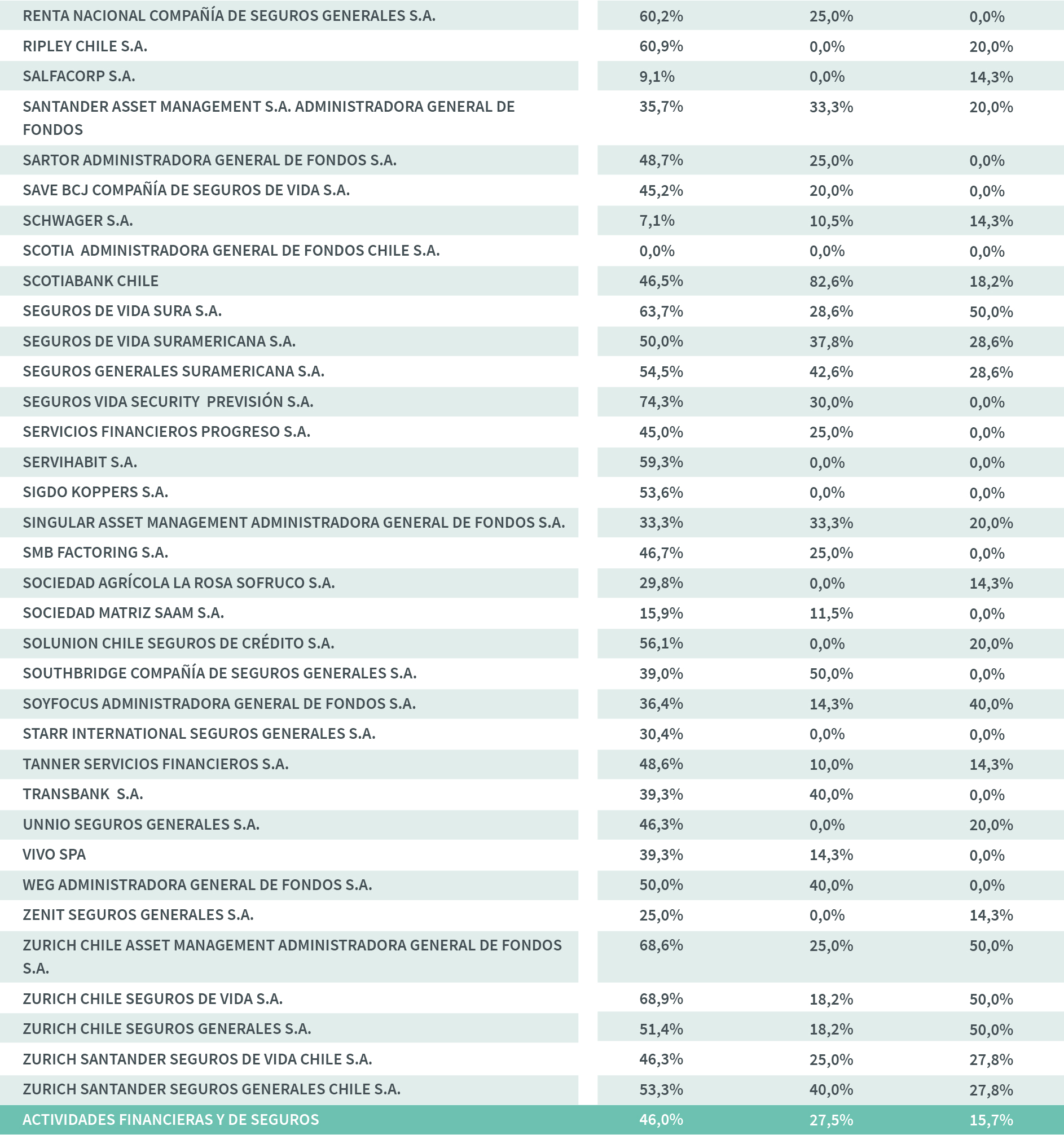 Para estandarizar la brecha salarial en base a la información reportada por las organizaciones a la CMF, se incluyeron aquellas que reportaron válidamente de acuerdo a lo indicado en ambas normas mencionadas. Según la NCG 386, “se deberá señalar la proporción que representa el sueldo bruto base promedio, por tipo de cargo, responsabilidad y función desempeñada, de las ejecutivas y trabajadoras, respecto de los ejecutivos y trabajadores”. Por otro lado, en la NCG 461 se señala que cada empresa “deberá informar la brecha salarial anual por sexo y para cada categoría de funciones (...), medida como el porcentaje que el salario bruto de las mujeres representa respecto del salario bruto de los hombres”.
