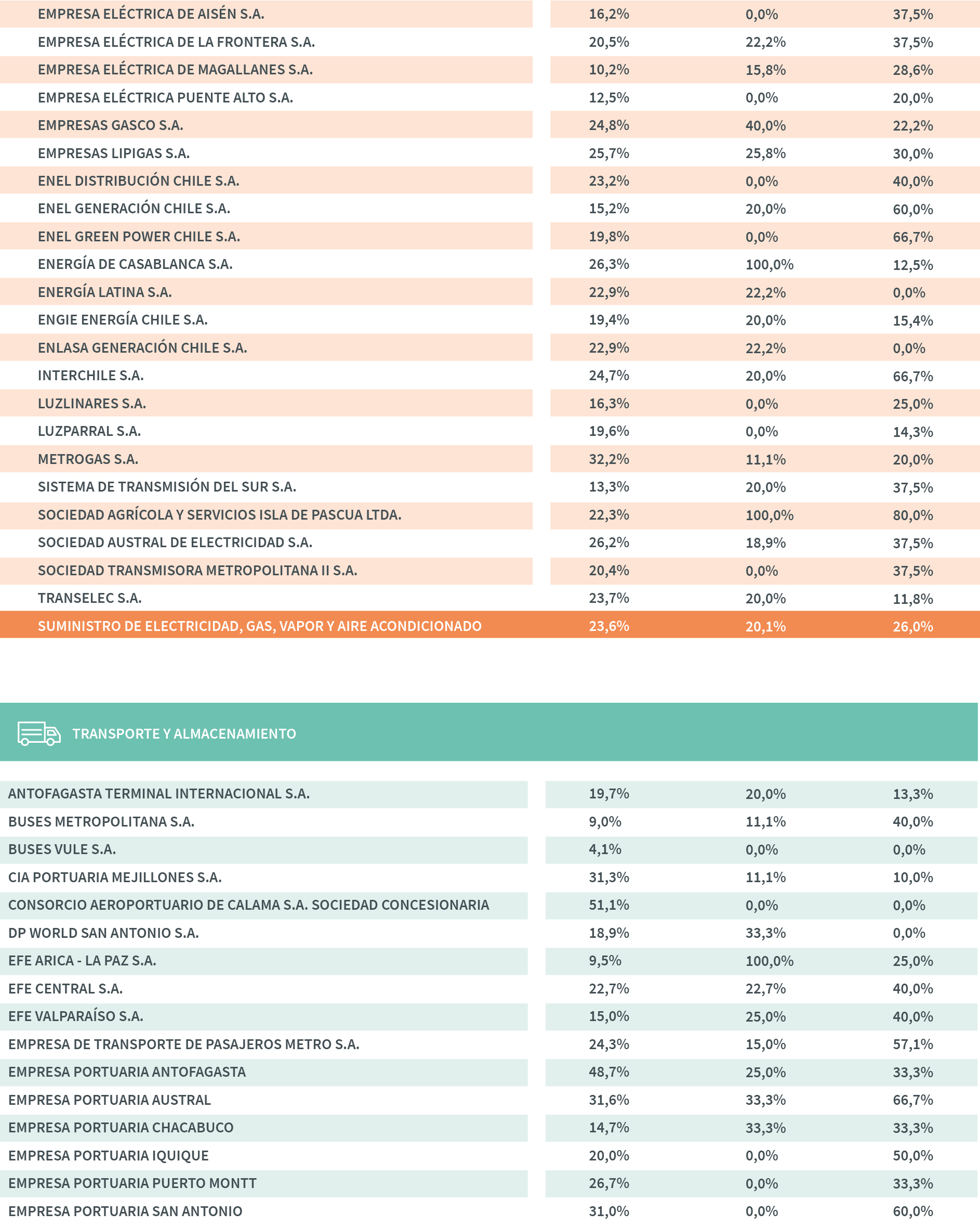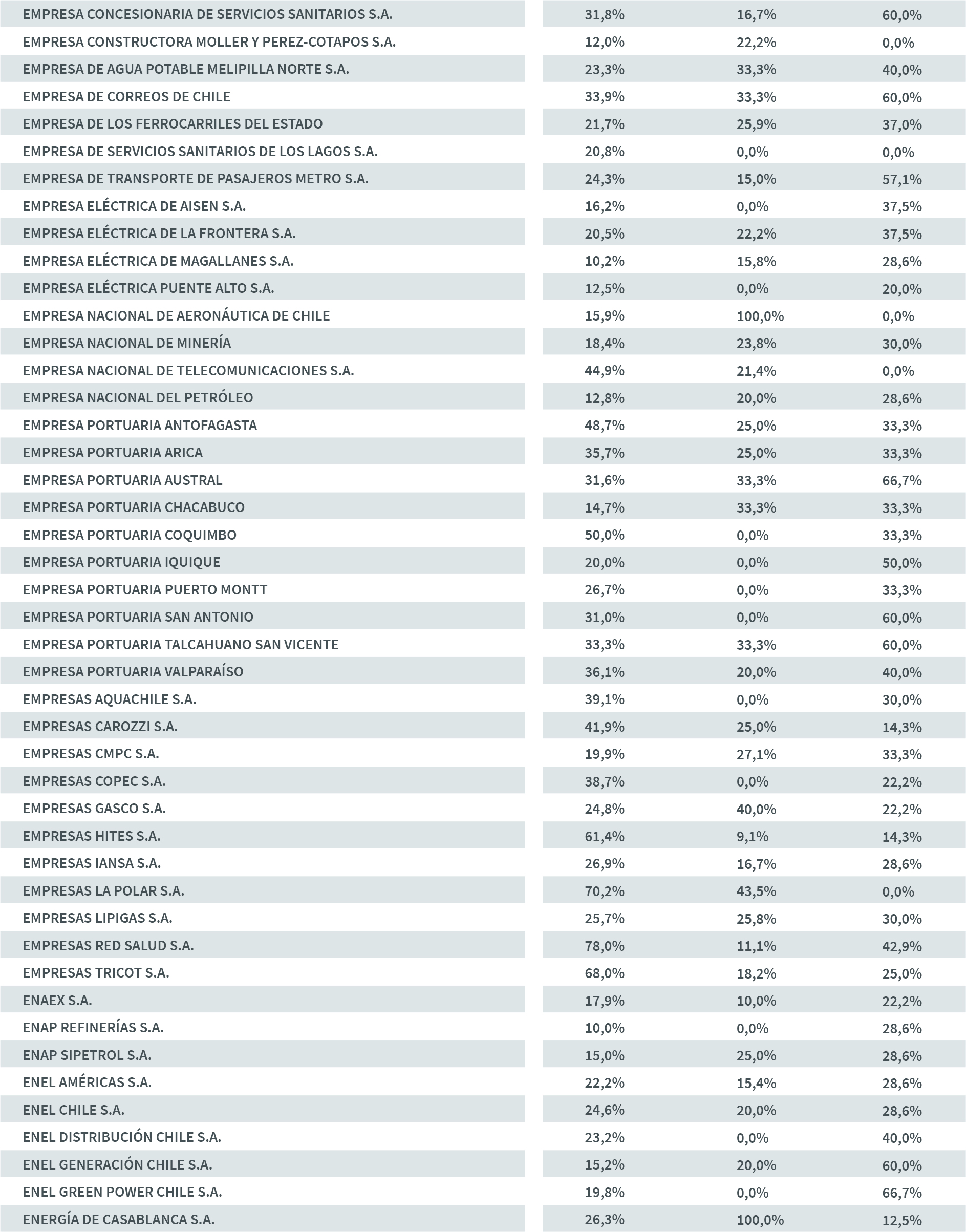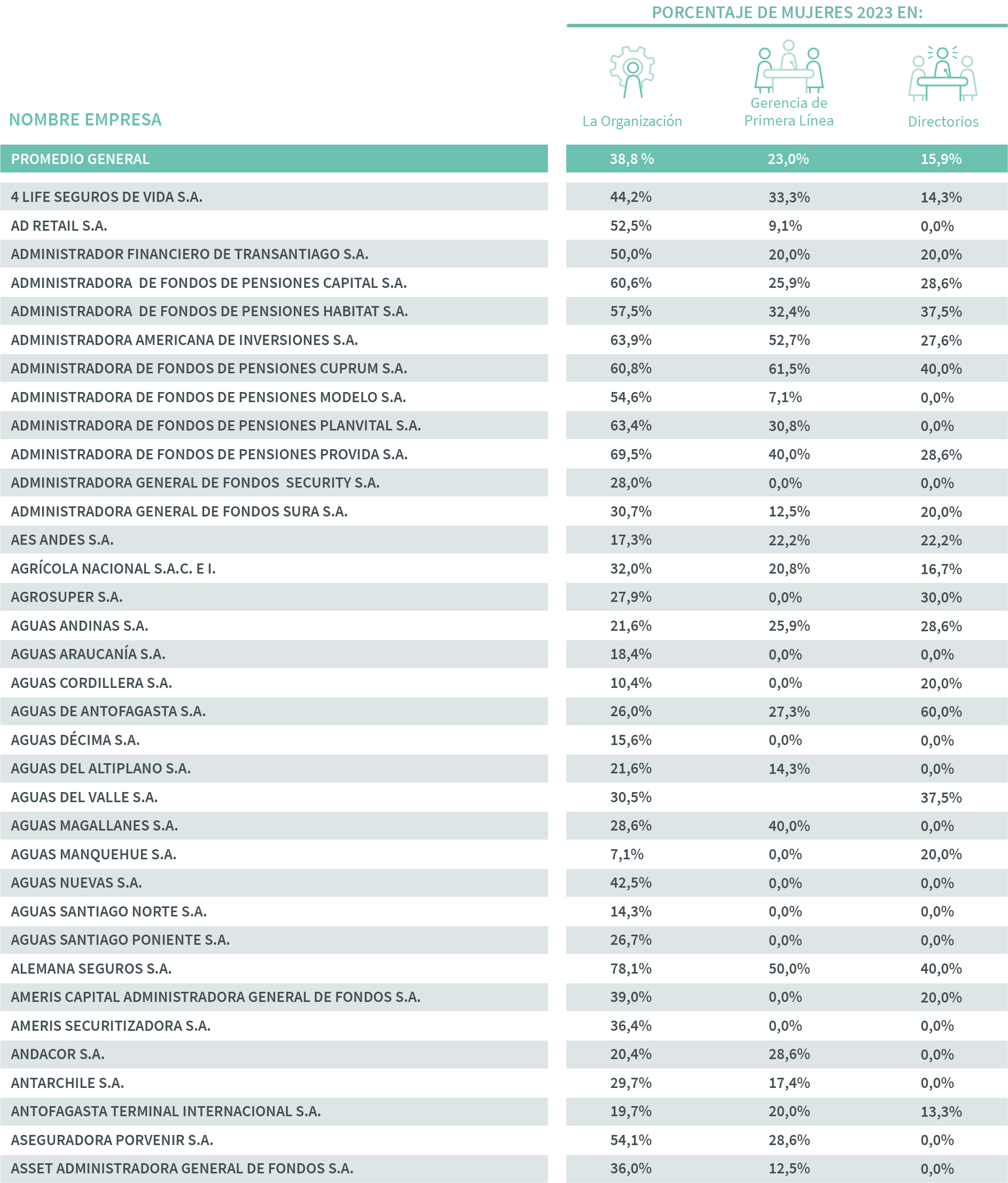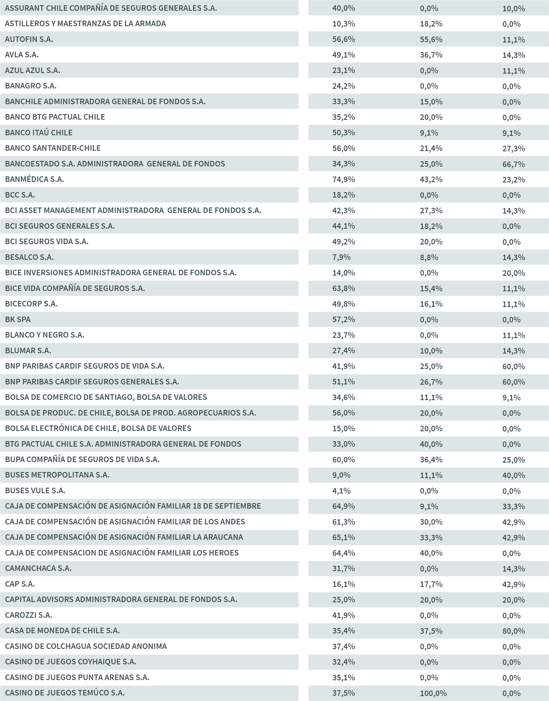 De las 466 empresas de la muestra utilizada para calcular porcentajes de participación el año 2023, 31 pertenecen al Índice de Precios Selectivos de Acciones. Si bien la cantidad que de empresas IPSA según datos de Bolsa de Comercio de Santiago son 30, una no presentó datos para este reporte (Banco de Chile), otra no cumplía con tener más de 10 personas trabajando (Sociedad de Inversiones Oro Blanco S.A) y dos de ellas reportaron como más de una empresa: BCI reportó como BCI Asset Managment Administradora General de Fondos S.A, BCI Seguros Generales S.A y BCI Seguros Vida S.A mientras Itaú Corpbanca reporta como Banco Itaú Chile e Itaú Administradora General de Fondos S.A. Con lo anterior, el número de empresas IPSA consideradas para este reporte queda en 31.