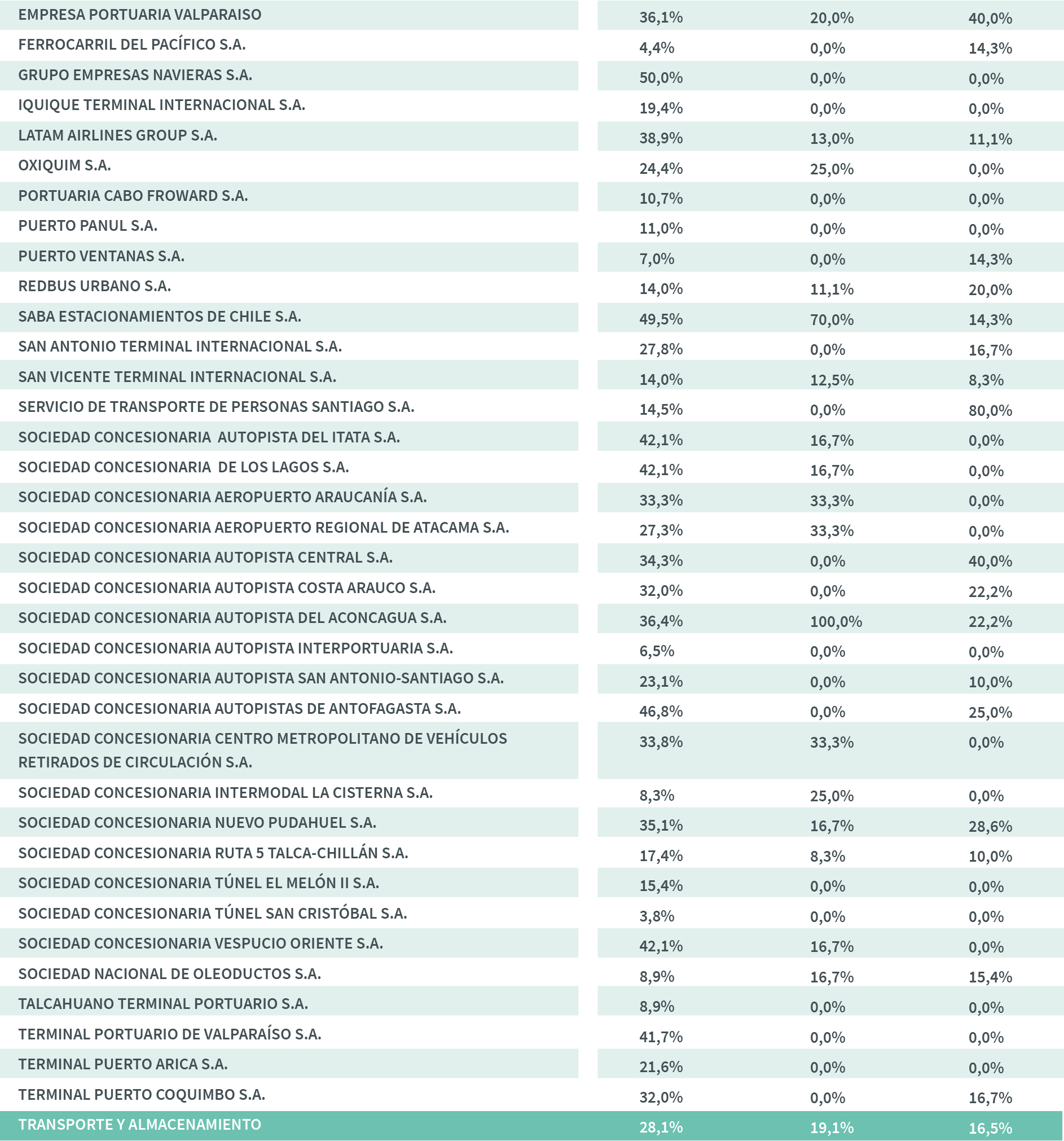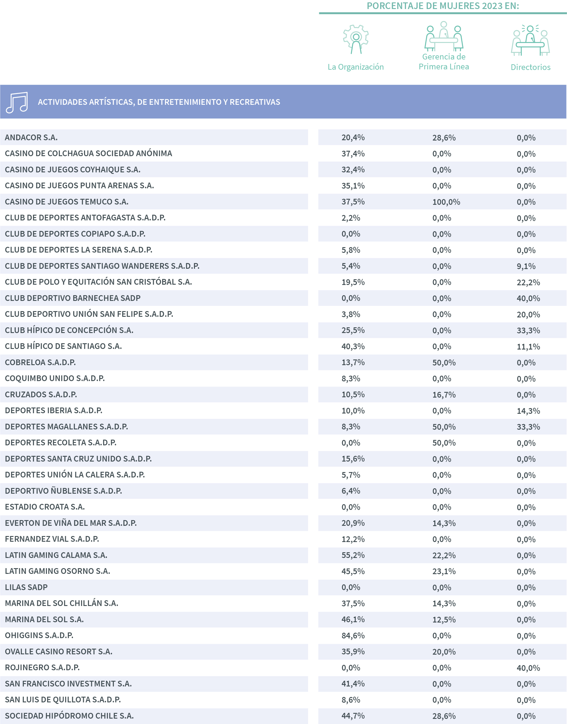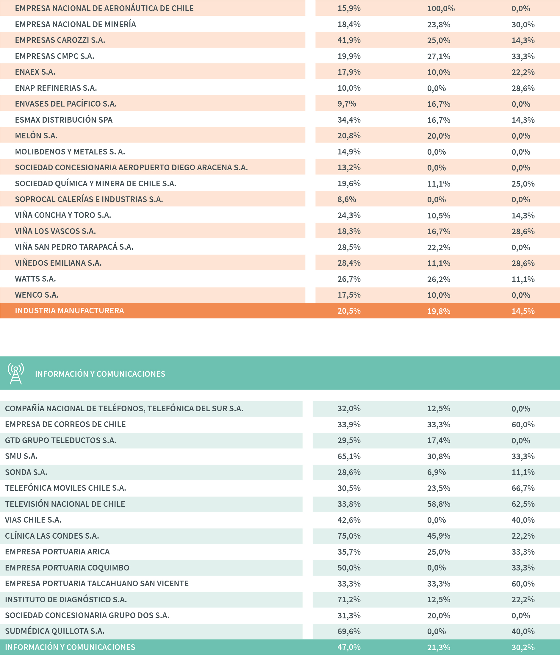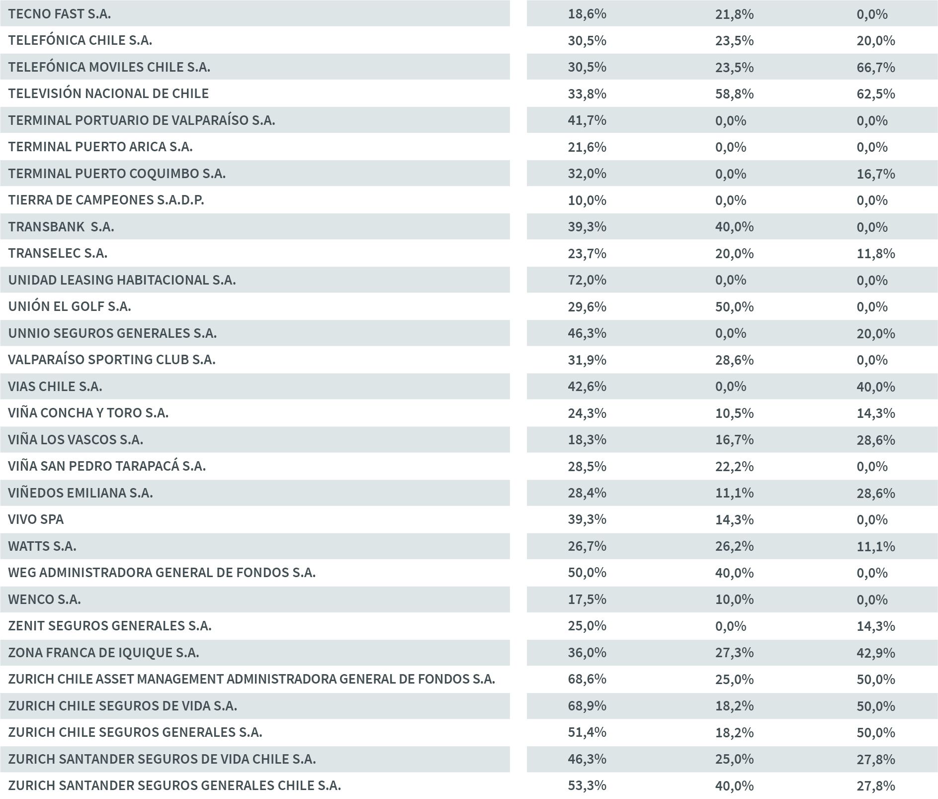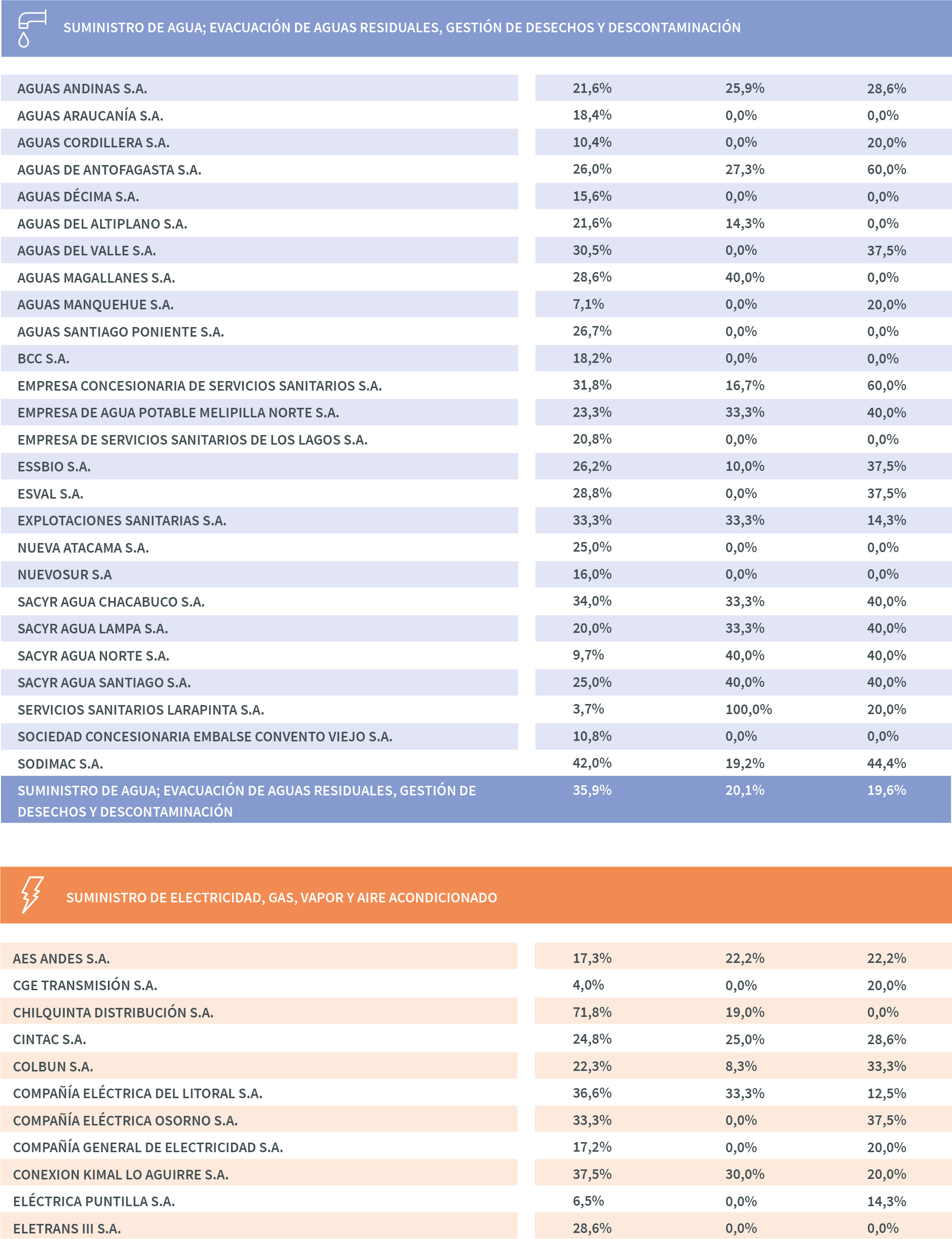De las 466 empresas de la muestra utilizada para calcular porcentajes de participación el año 2023, 31 pertenecen al Índice de Precios Selectivos de Acciones. Si bien la cantidad que de empresas IPSA según datos de Bolsa de Comercio de Santiago son 30, una no presentó datos para este reporte (Banco de Chile), otra no cumplía con tener más de 10 personas trabajando (Sociedad de Inversiones Oro Blanco S.A) y dos de ellas reportaron como más de una empresa: BCI reportó como BCI Asset Managment Administradora General de Fondos S.A, BCI Seguros Generales S.A y BCI Seguros Vida S.A mientras Itaú Corpbanca reporta como Banco Itaú Chile e Itaú Administradora General de Fondos S.A. Con lo anterior, el número de empresas IPSA consideradas para este reporte queda en 31.