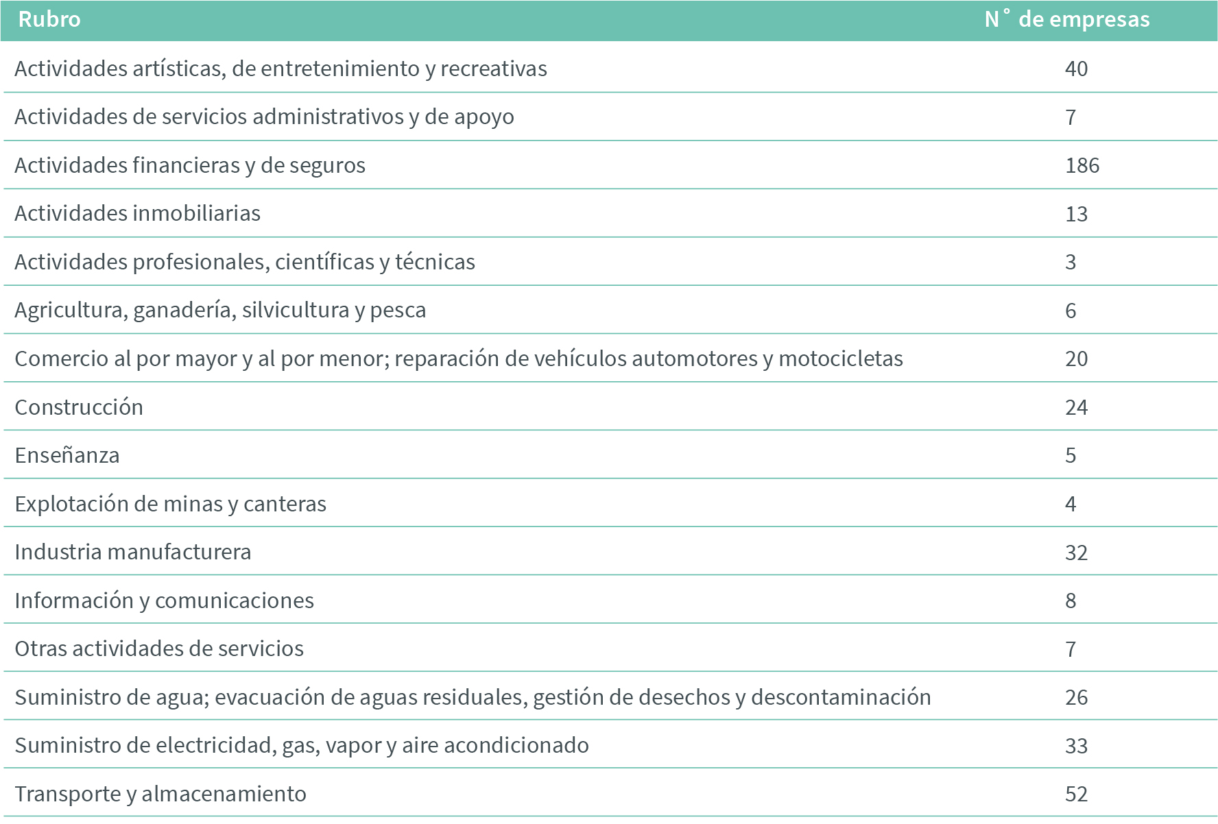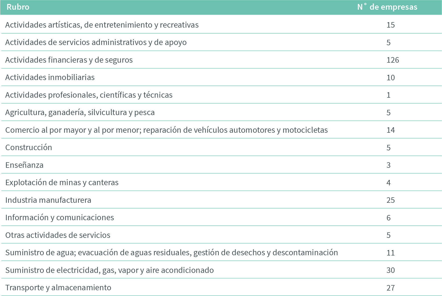 Para realizar un análisis detallado de la información recopilada y, en línea con los reportes de años previos, no se consideran las empresas que no tengan actividad comercial reportada ni aquellas que tengan menos de 10 personas trabajadoras. De esta forma, se eliminan 17 empresas por no reportar rubro económico al Servicio de Impuestos Internos para el año 2022 y luego otras 183 por estar bajo el umbral del número de trabajadoras y trabajadores. Hubo 6 empresas que no cumplían ninguna de las dos condiciones. De esta forma, finalmente se consideraron 466 empresas (410 que reportaron por NCG 386 y 56 que lo hicieron por NCG 461), con 939.566 personas trabajando en ellas. De las empresas con las cuales se utilizó la información proveniente de la NCG 461, 54 habían reportado la NCG 386 en años anteriores y dos entregaron información por primera vez.
