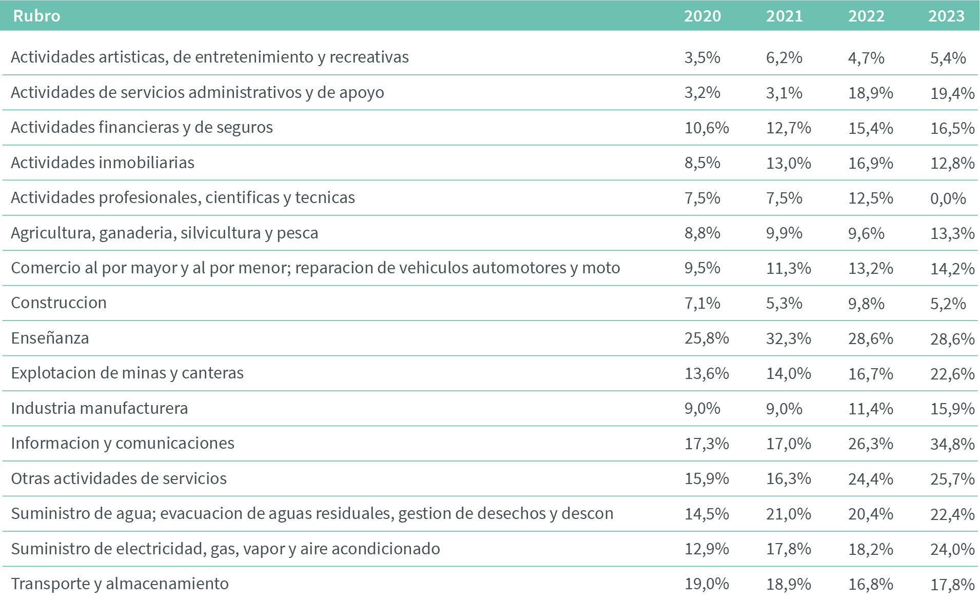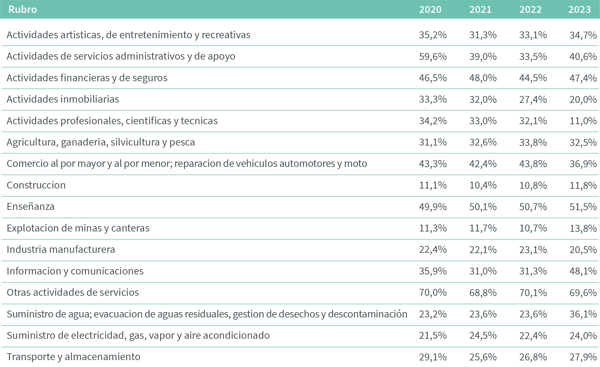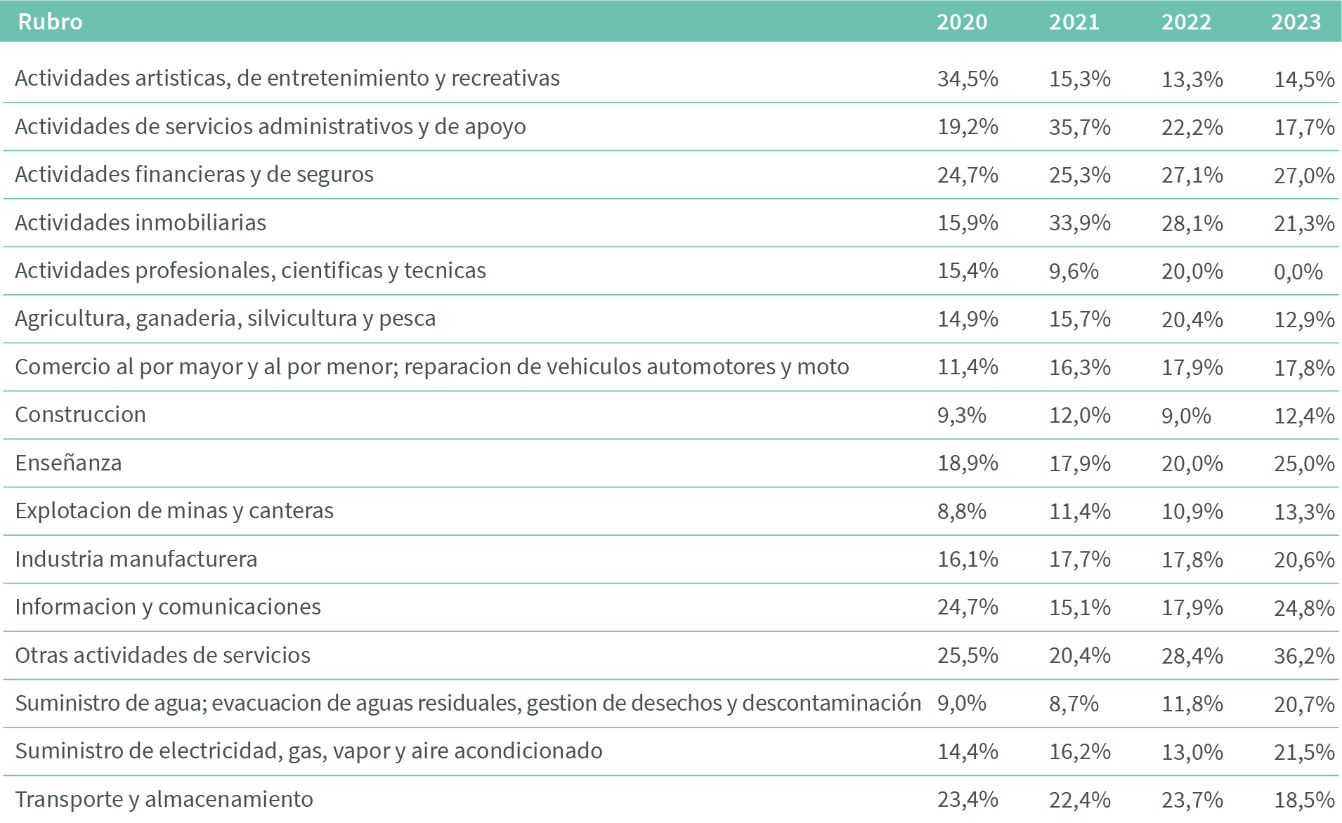 Si bien la diferencia entre ambas metodologías es menor a 1 punto porcentual para cualquier indicador de cualquier año, para poder analizar la evolución de los porcentajes de participación, la comparación requiere que se analice la misma muestra para cada año. Este criterio se utilizó al analizar la información agregada y desagregada por rubro económico, en el ítem “Empresas Cero” y para todos los indicadores que se reportaron para el periodo 2020-2023.