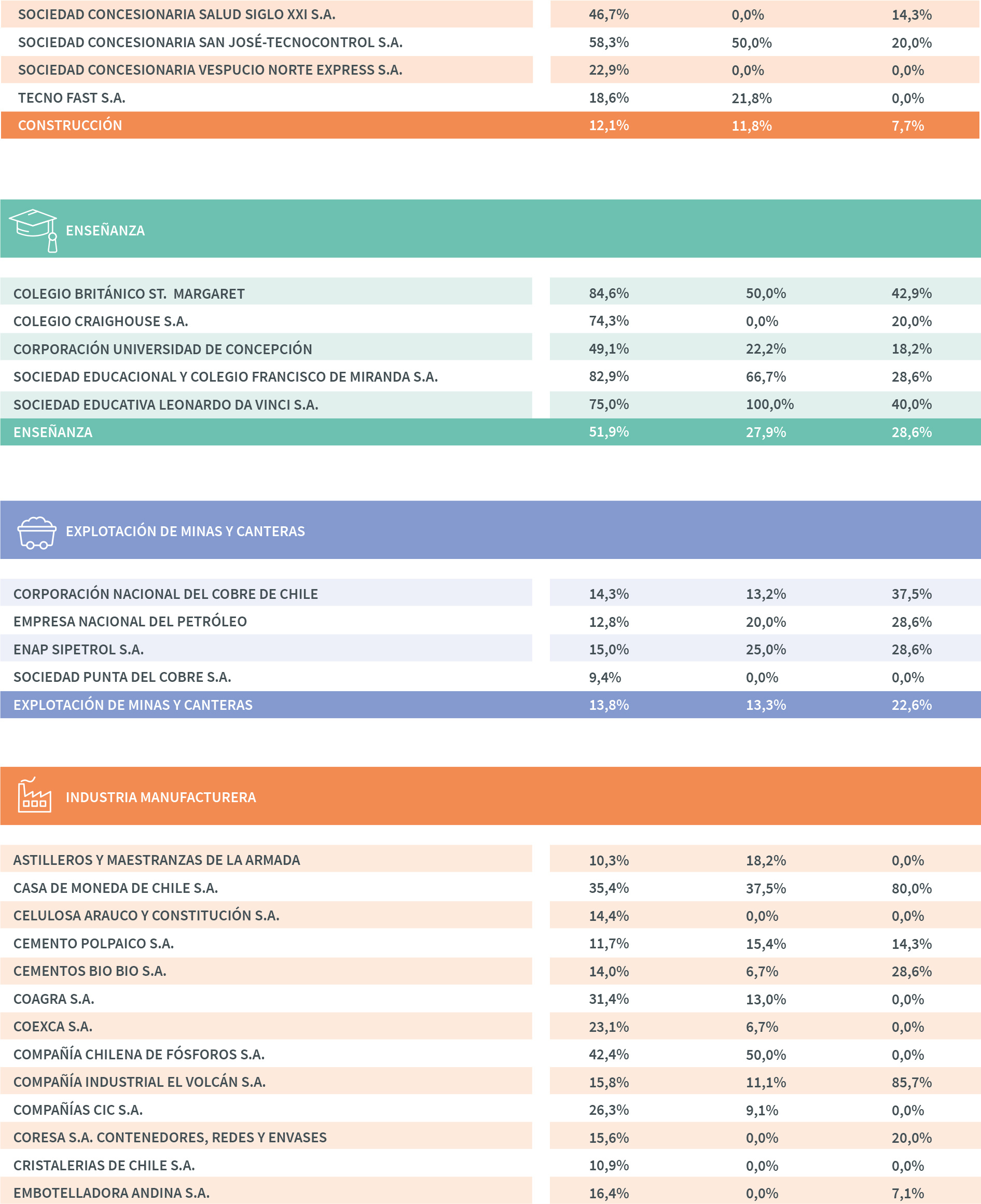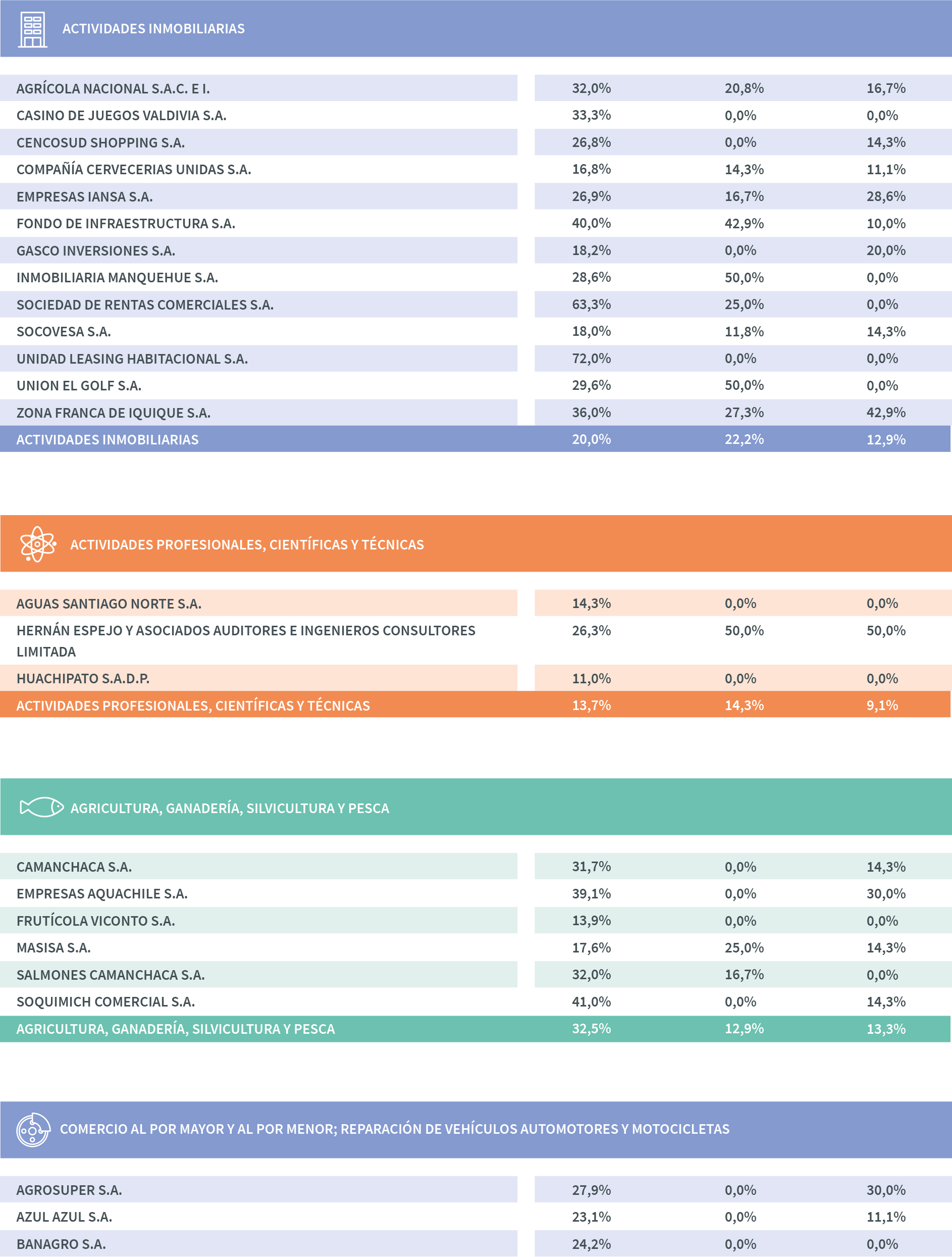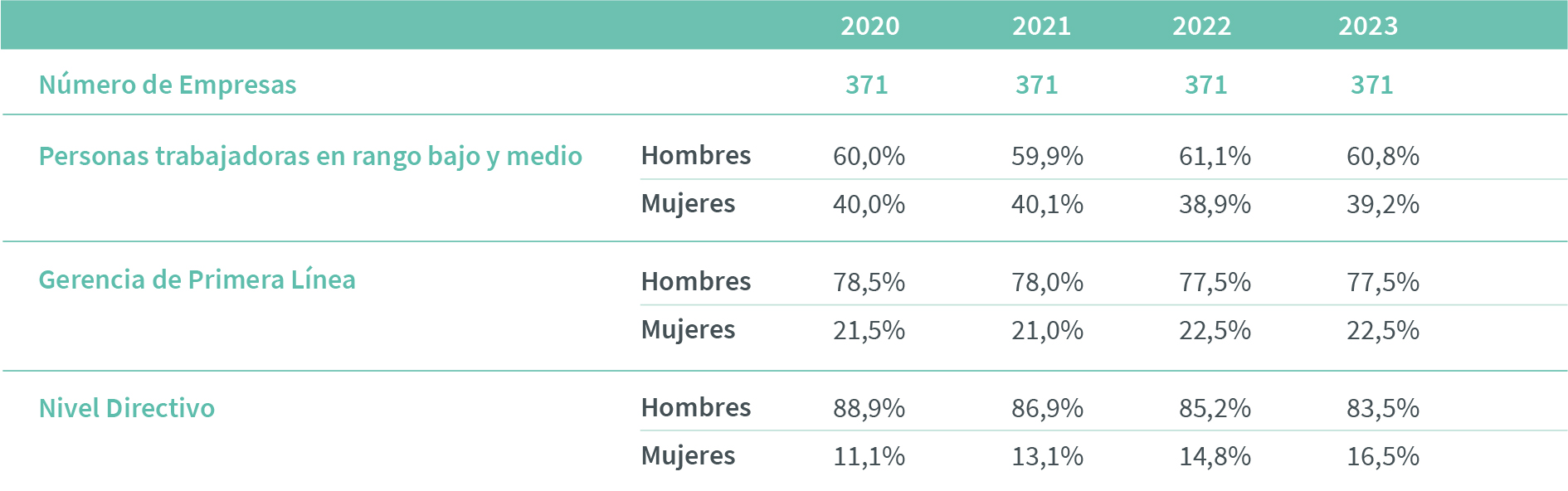 Una dificultad importante al analizar la evolución de indicadores por año han sido las empresas que entran y salen de la muestra. Al estudiar los cambios anuales por rubro se le agrega el problema de las empresas que cambian de rubro entre un año y otro, lo que podría generar variaciones de alta magnitud que no se expliquen por cambios en la proporción entre hombres y mujeres en las empresas. Para solucionar esto, sólo se consideraron las empresas que mantienen el mismo rubro en el periodo 2020-2023. De esta manera, en los Cuadro A10, Cuadro A11 y Cuadro A12 se muestran los indicadores de participación por actividad económica entre 2020 y 2023 considerando las 371 empresas con las cuales se hicieron las estadísticas de participación a nivel general.