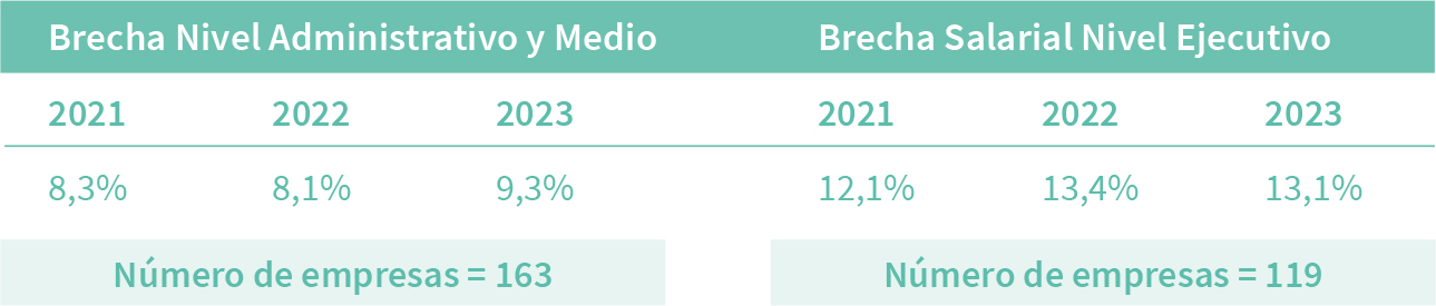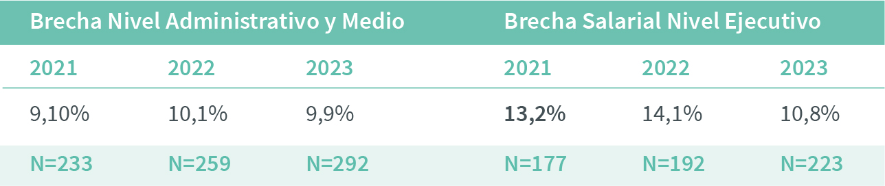 El reporte de la brecha salarial a nivel administrativo y medio considera los resultados de 163 empresas para el periodo 2020-2022, mientras que para el nivel ejecutivo son 119 observaciones. En ambos casos se calculó como un promedio simple de las brechas a nivel de empresa.