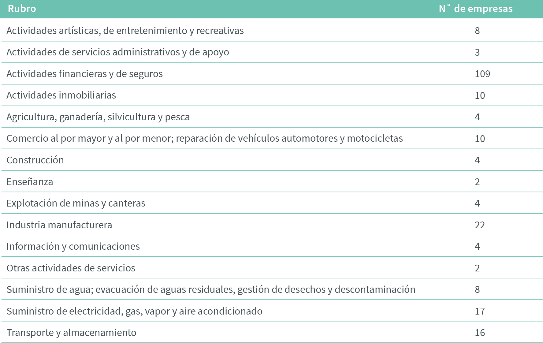 Número de empresas por rubro económico que se utilizaron para calcular porcentajes de participación en 2023