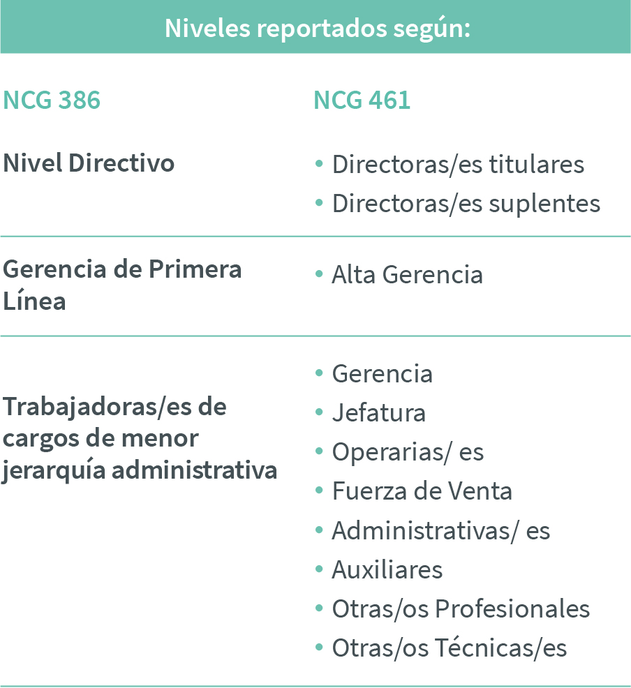 La NCG 386 y la NCG 461 especifican que se debe reportar el número de hombres y mujeres en distintos niveles jerárquicos de la organización. Sin embargo, las normas difieren en cuanto al número de niveles que se reportan. En la NCG 386 se entrega información para tres niveles: nivel directivo, gerencia de primera línea y trabajadoras/es de cargos de menor jerarquía administrativa. La información de la NCG 461 se presenta con un mayor nivel de desagregación en comparación con la NCG 386. Con el propósito de homologar los datos de ambas normas, se agrupan las categorías de la NCG 461 conforme a la clasificación establecida en la NCG 386, de la siguiente manera: