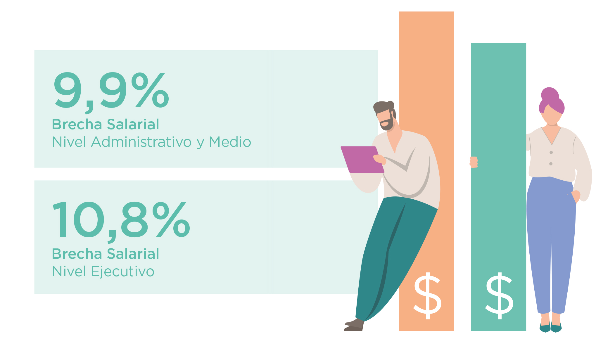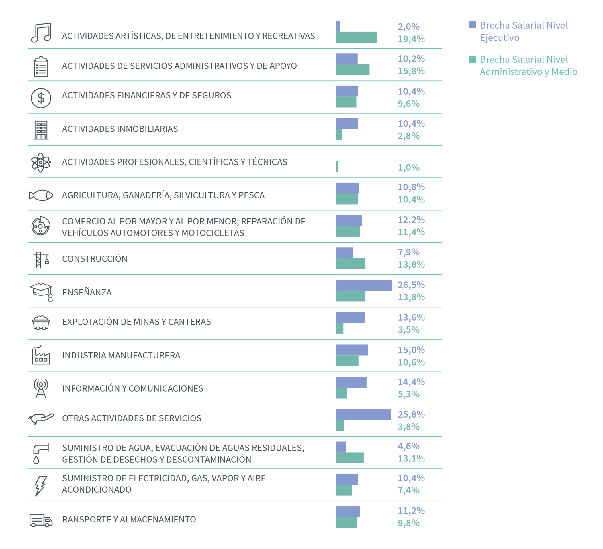 istro de agua, evacuación de aguas residuales, gestión de desechos y descontaminación. Por otro lado, existen rubros donde los cargos ejecutivos tienen mayores brechas salariales que los administrativos y medios, como es el caso de Otras actividades de servicios, Información y comunicaciones, y Explotación de minas y canteras. Enseñanza presenta altas brechas en ambos niveles.