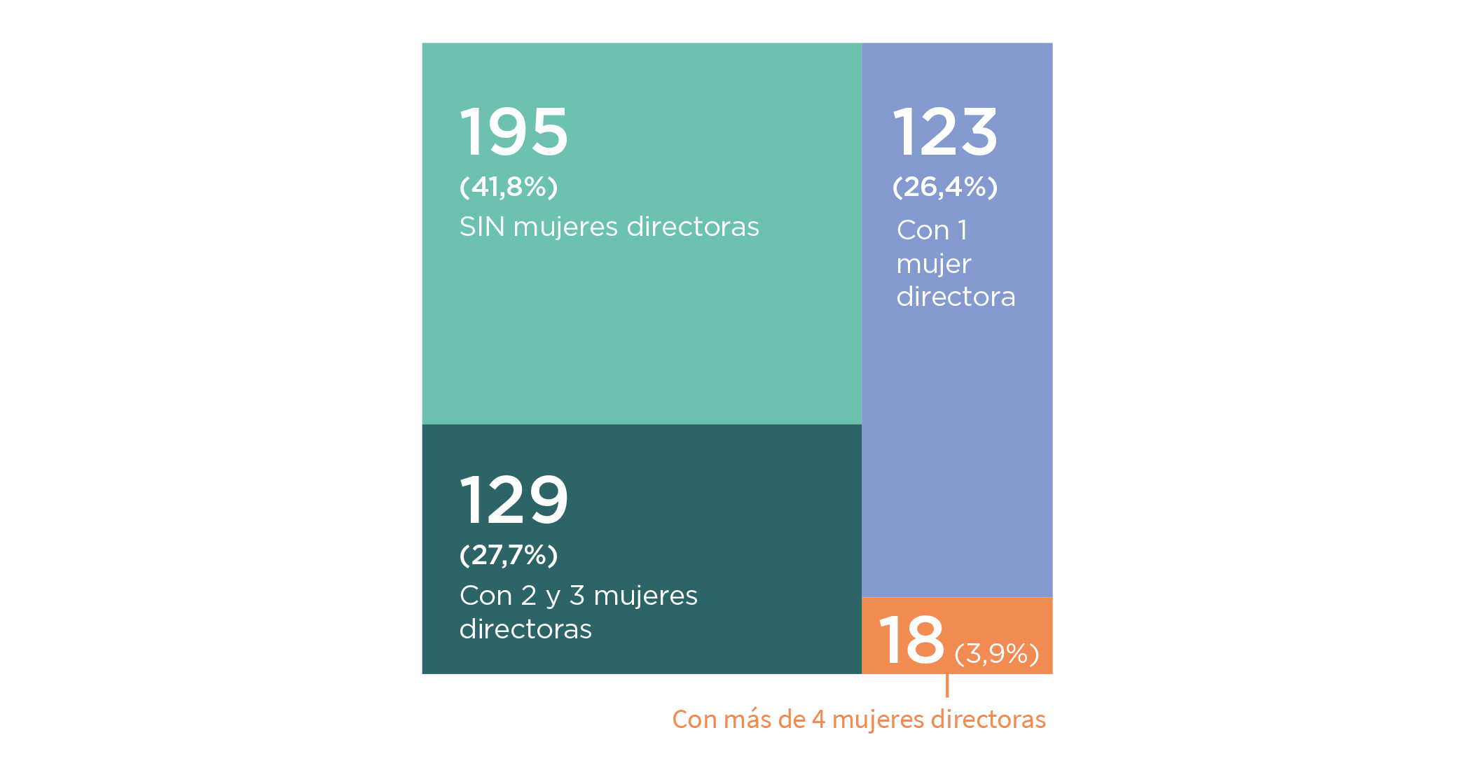 [18] Existe 1 empresa que no emplea a ninguna persona, mujer u hombre, en cargos directivos. Si se incluye esta empresa en el análisis, el total asciende a 196, lo que representa un 42,0% del total de empresas.